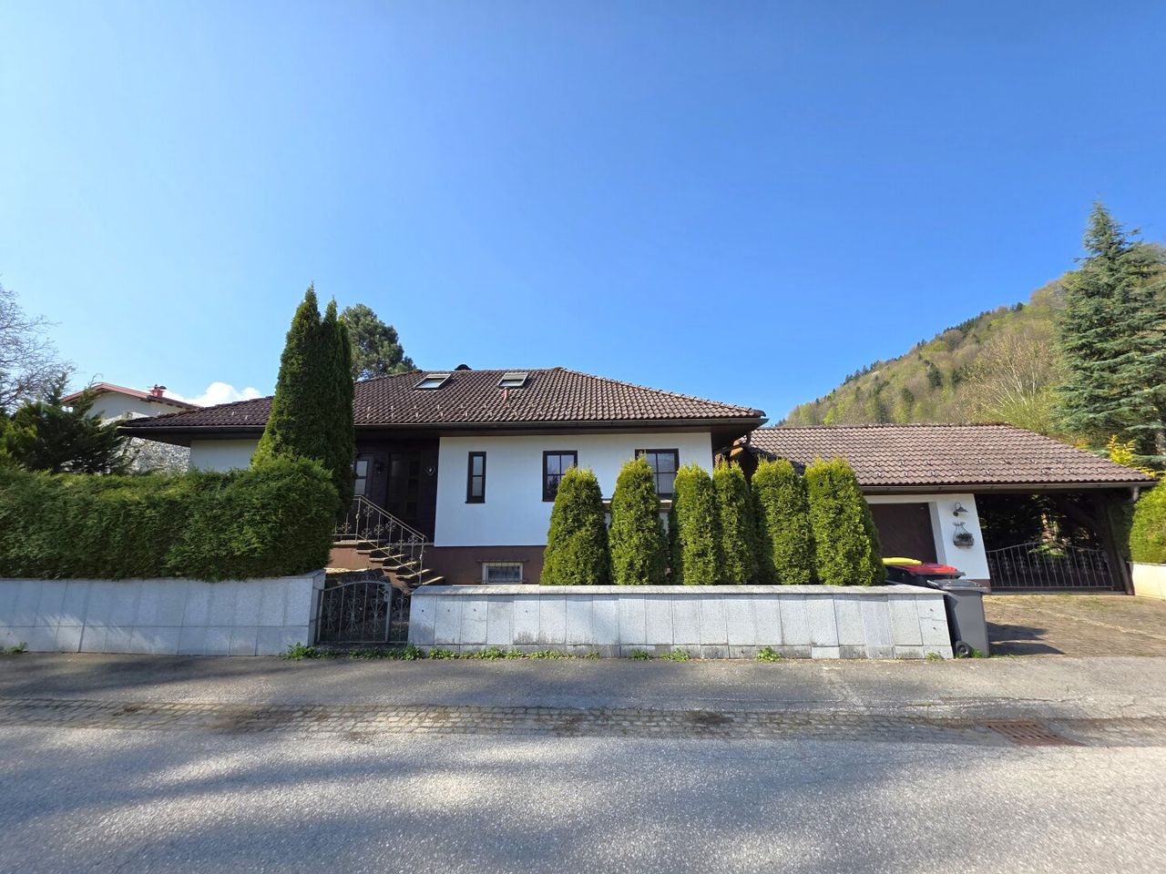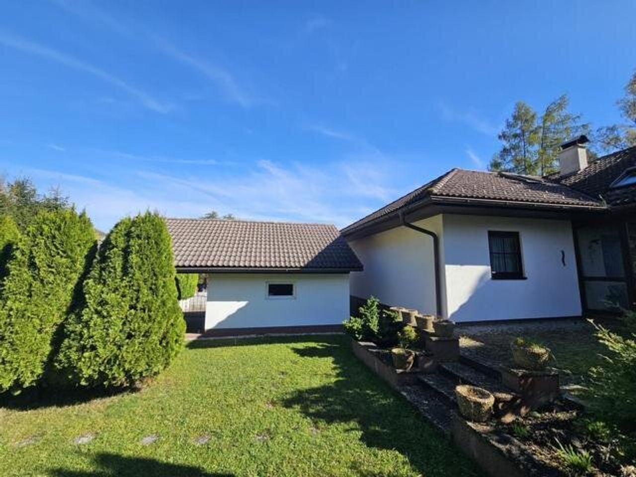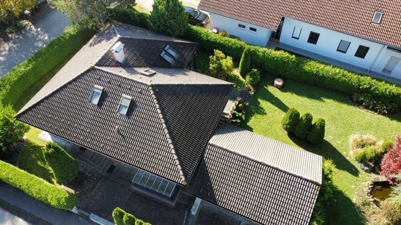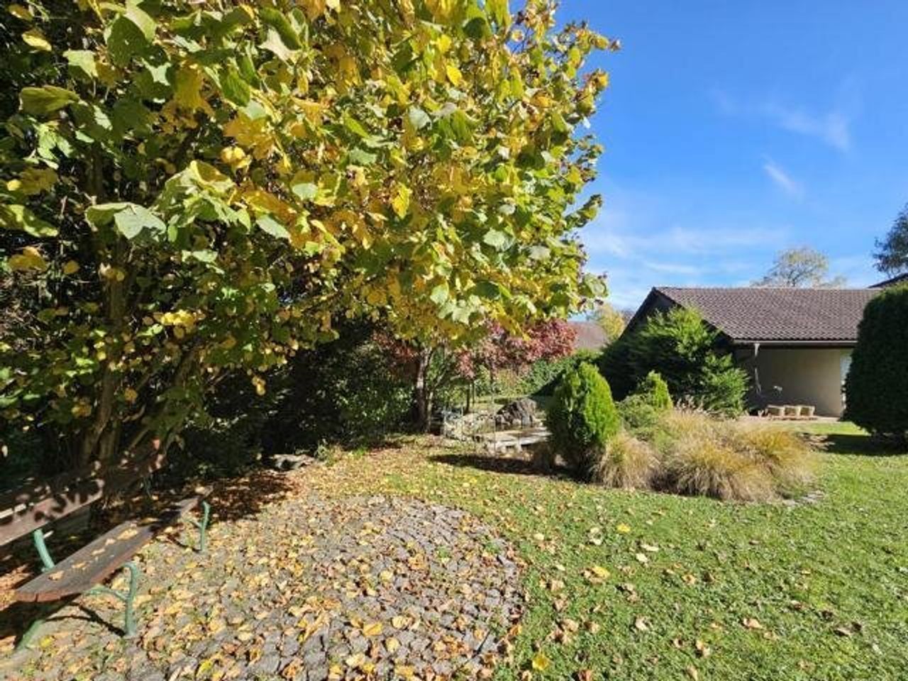 Der idyllische Garten mit einem Biotop lädt zum Verweilen ein und schafft eine erholsame Oase im Freien. Darüber hinaus stehen eine Garage, ein Carport und 2 Stellplätze im Freien zur Verfügung.