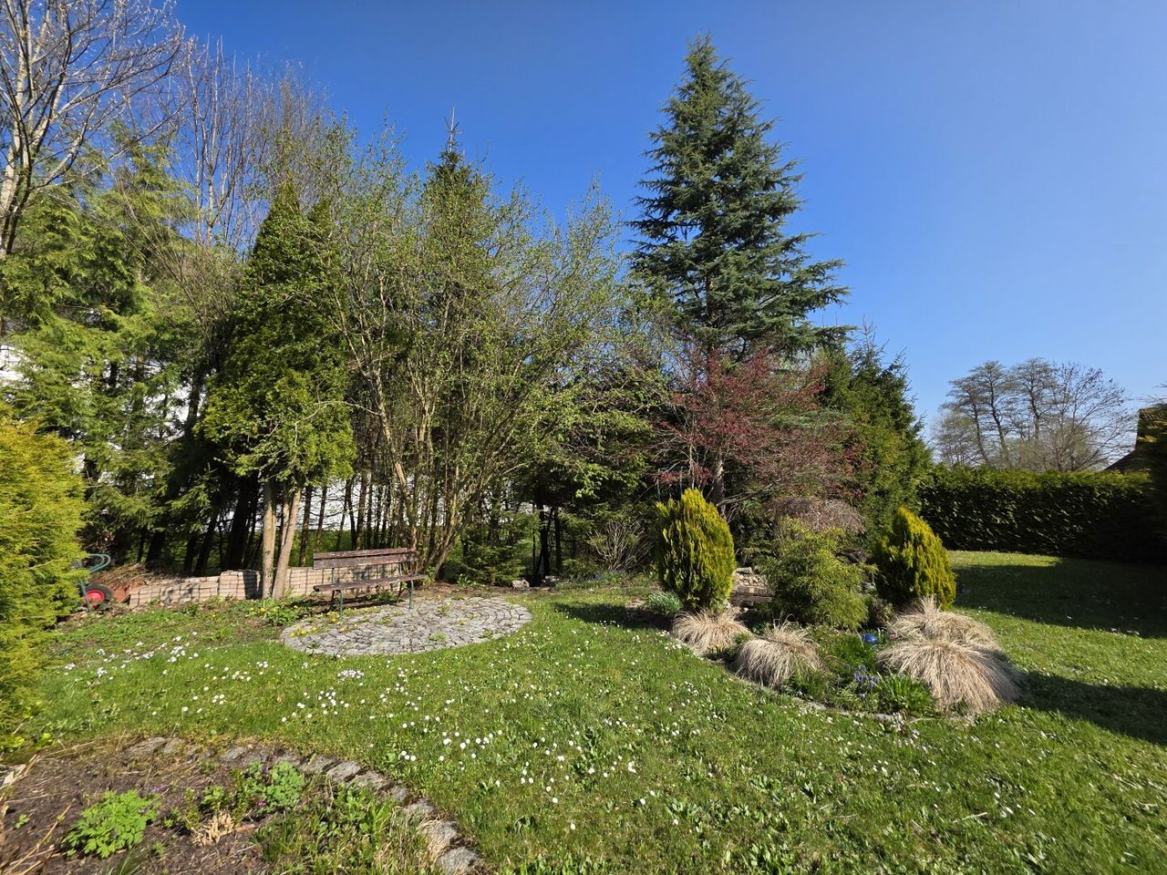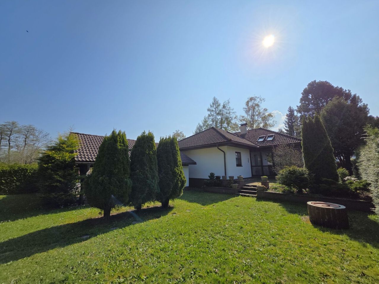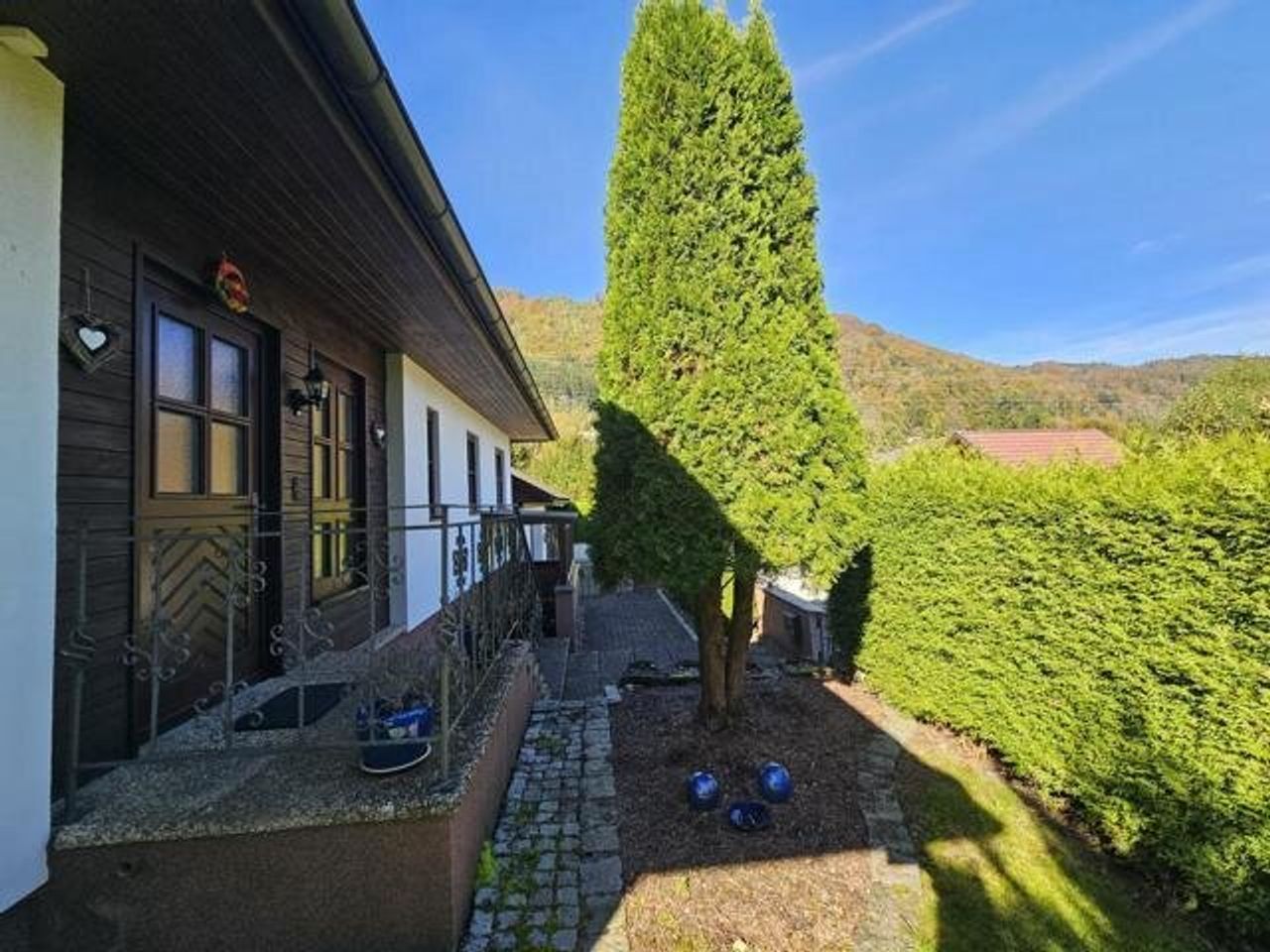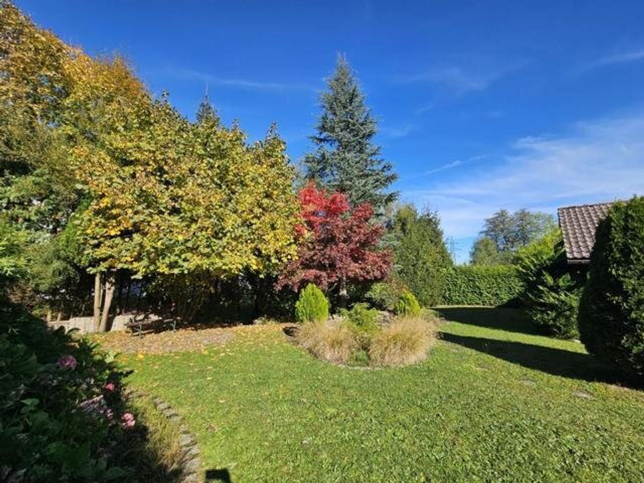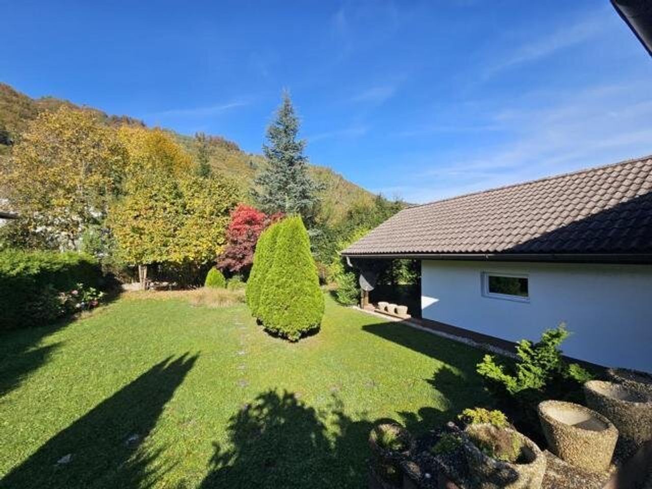 Der idyllische Garten mit einem Biotop lädt zum Verweilen ein und schafft eine erholsame Oase im Freien. Darüber hinaus stehen eine Garage, ein Carport und 2 Stellplätze im Freien zur Verfügung.