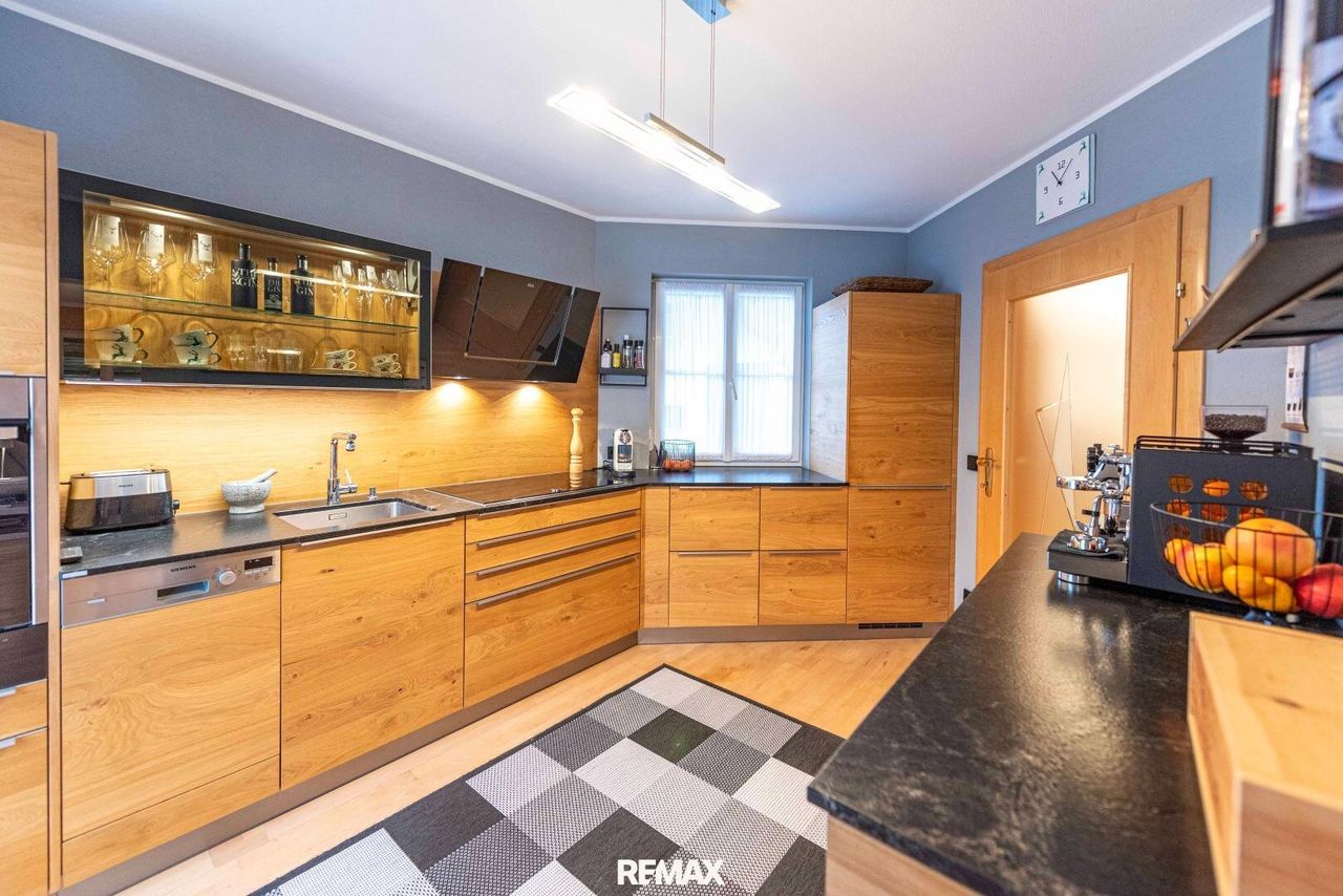 Die neue, hochwertig ausgestattete Küche lädt zum Kochen und Verweilen ein, mit direkten Ausgang auf eine Terrasse.