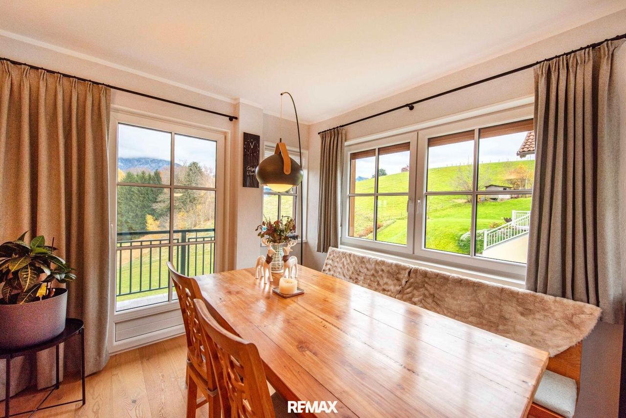 Auf der Hauptebene empfängt Sie ein großzügiger Eingangsbereich, der in das helle Wohnzimmer mit Kachelofen übergeht. Von hier öffnen sich sowohl der vorgelagerte Balkon als auch der Essbereich im Wintergarten – beides Orte, an denen Sie den atemberaubenden Blick über den See und die Berge genießen können.