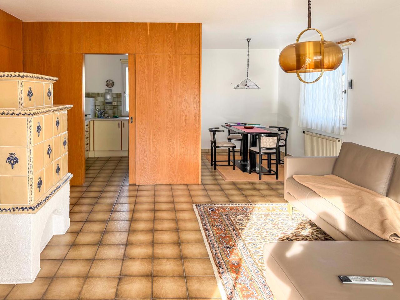 Über das Stiegenhaus geht es weiter in die eigentliche Wohnebene. Dort erwartet Sie eine gut durchdachte Raumaufteilung mit einem hellen Wohn‑ und Essbereich als Mittelpunkt. Der dort befindliche Kachelofen sorgt an kühlen Tagen für eine behagliche Atmosphäre.