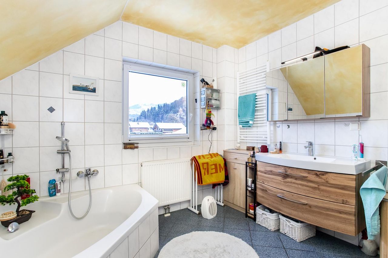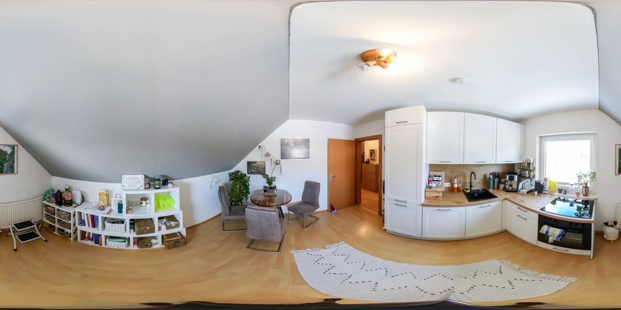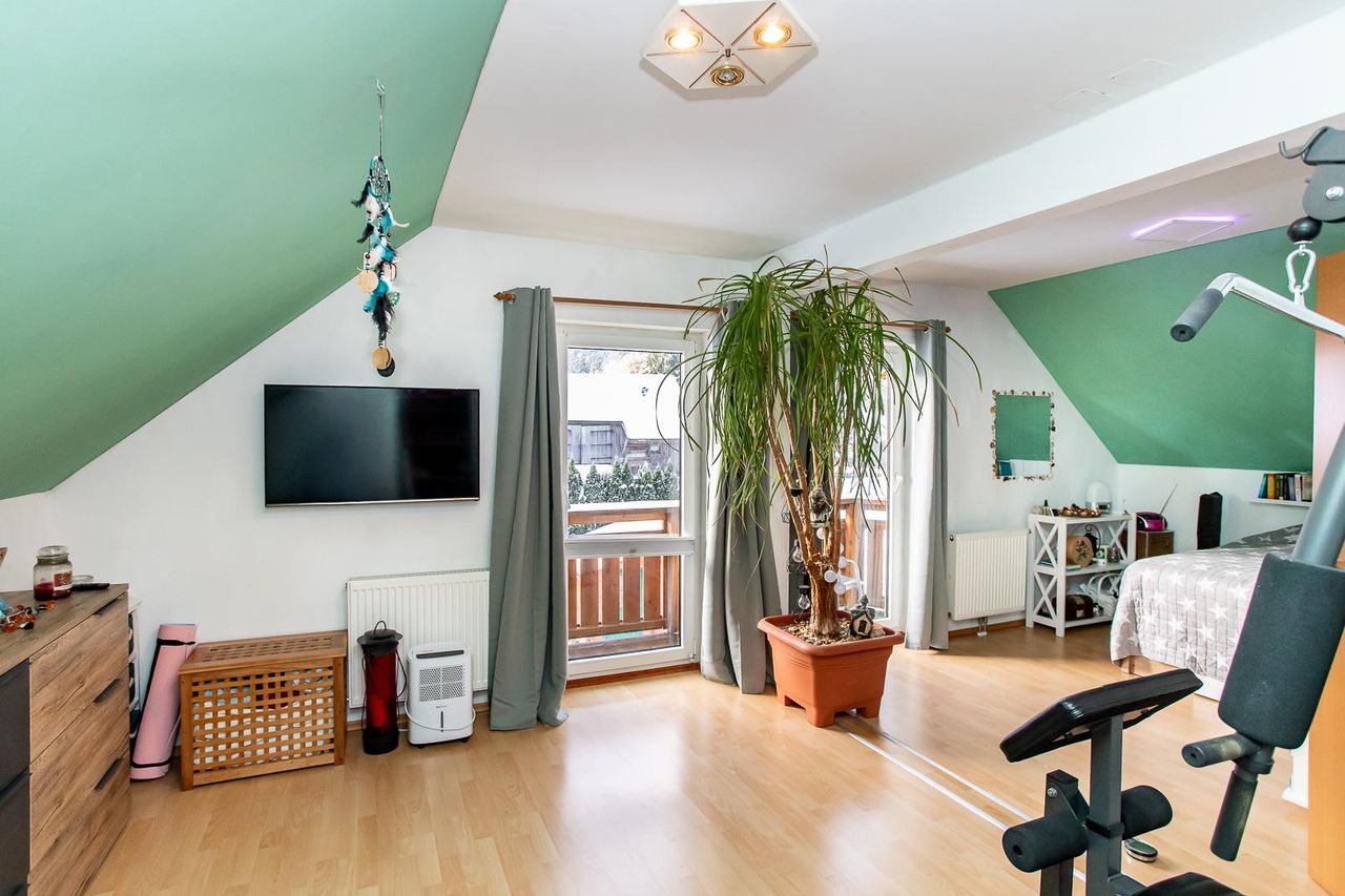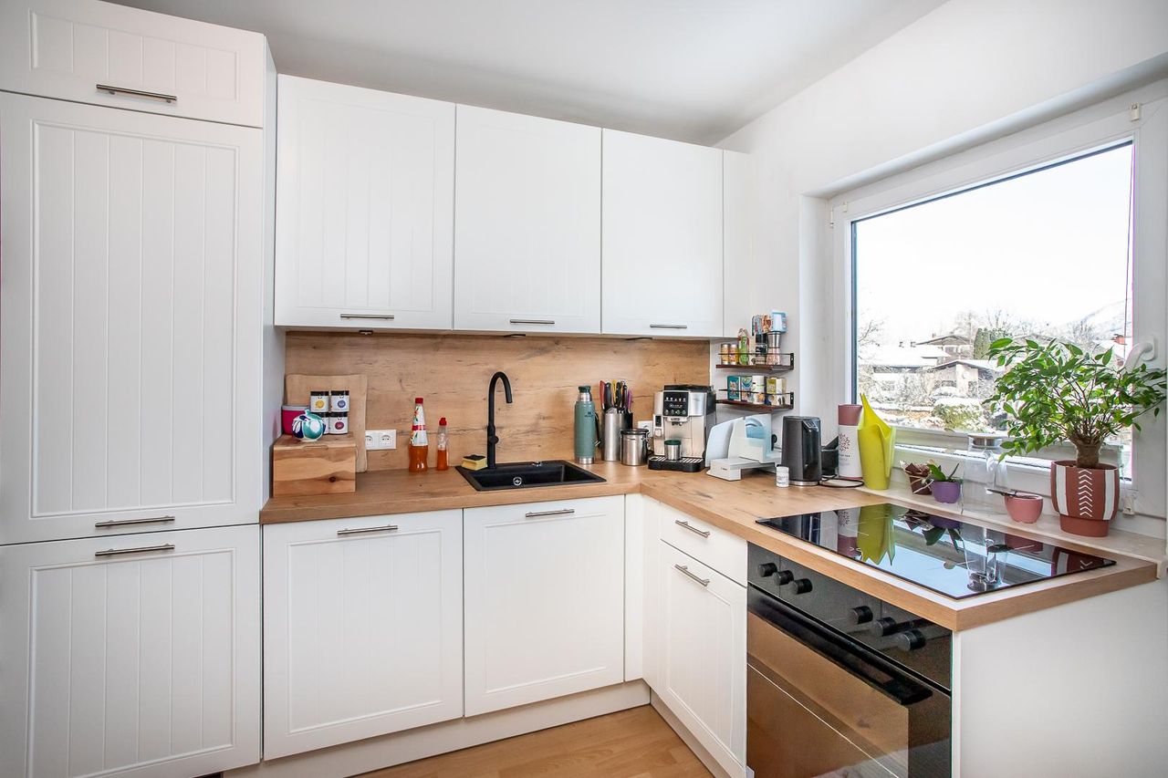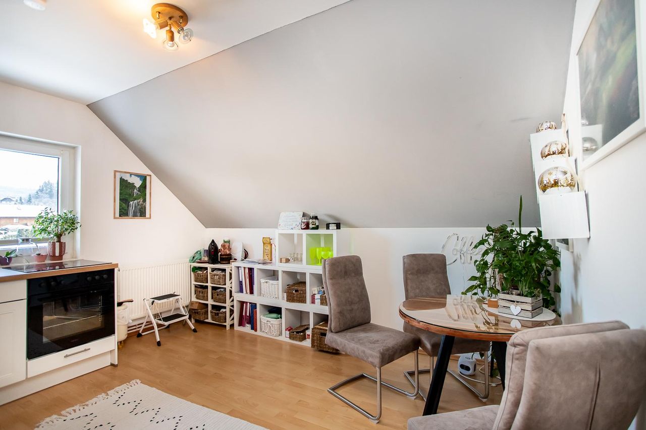 Über die Treppe gelangt man in das Obergeschoss, das mit einem Wohn- und Schlafraum eine gemütliche, eigenständige Wohnetage bildet, dessen beide Haupträume direkten Zugang zum Balkon haben – ein Ort der Leichtigkeit mit schönem Ausblick. Angrenzend sorgt ein Schrankraum für Ordnung und zusätzlichen Komfort. Die Küche bietet ausreichend Platz zum Kochen und Essen und lässt sich dank ihrer vorteilhaften Größe und Schnittführung optimal möblieren. Das Badezimmer mit Badewanne und WC bietet einen ruhigen Rückzugsort zum Entspannen und Auftanken. Ergänzt wird diese Ebene durch die beiden Seitenböden, in denen all die Dinge ihren Platz finden, die zwar selten in die Hand genommen, aber dennoch wichtig sind. Zusätzlich bietet der Dachboden wertvolle Abstellfläche für alles, was nicht täglich benötigt wird.