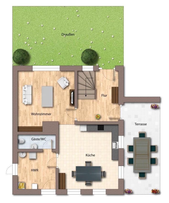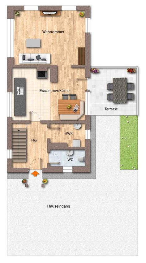 • Erdgeschoss: Küche, Wohnzimmer, WC
