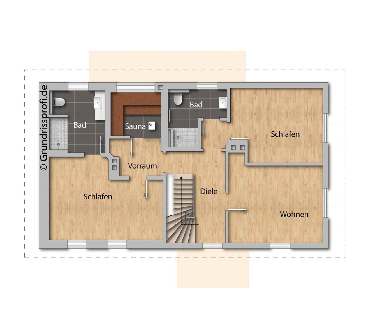 Im Obergeschoss befinden sich zwei Schlafzimmer, zwei stilvolle Bäder, eine Sauna und ein noch unausgebautes Dachgeschoss, das als Raumreserve für eine zusätzliche Wohneinheit dient – ideal für Gäste, ein Atelier oder Homeoffice.