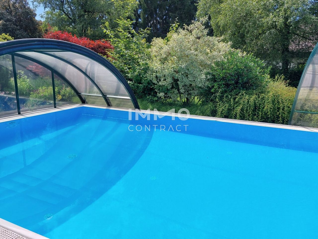 Der Swimmingpool im Garten ist ein Überlaufbecken mit einer Gegenstromanlage und hat eine gläserne Überdachung.
