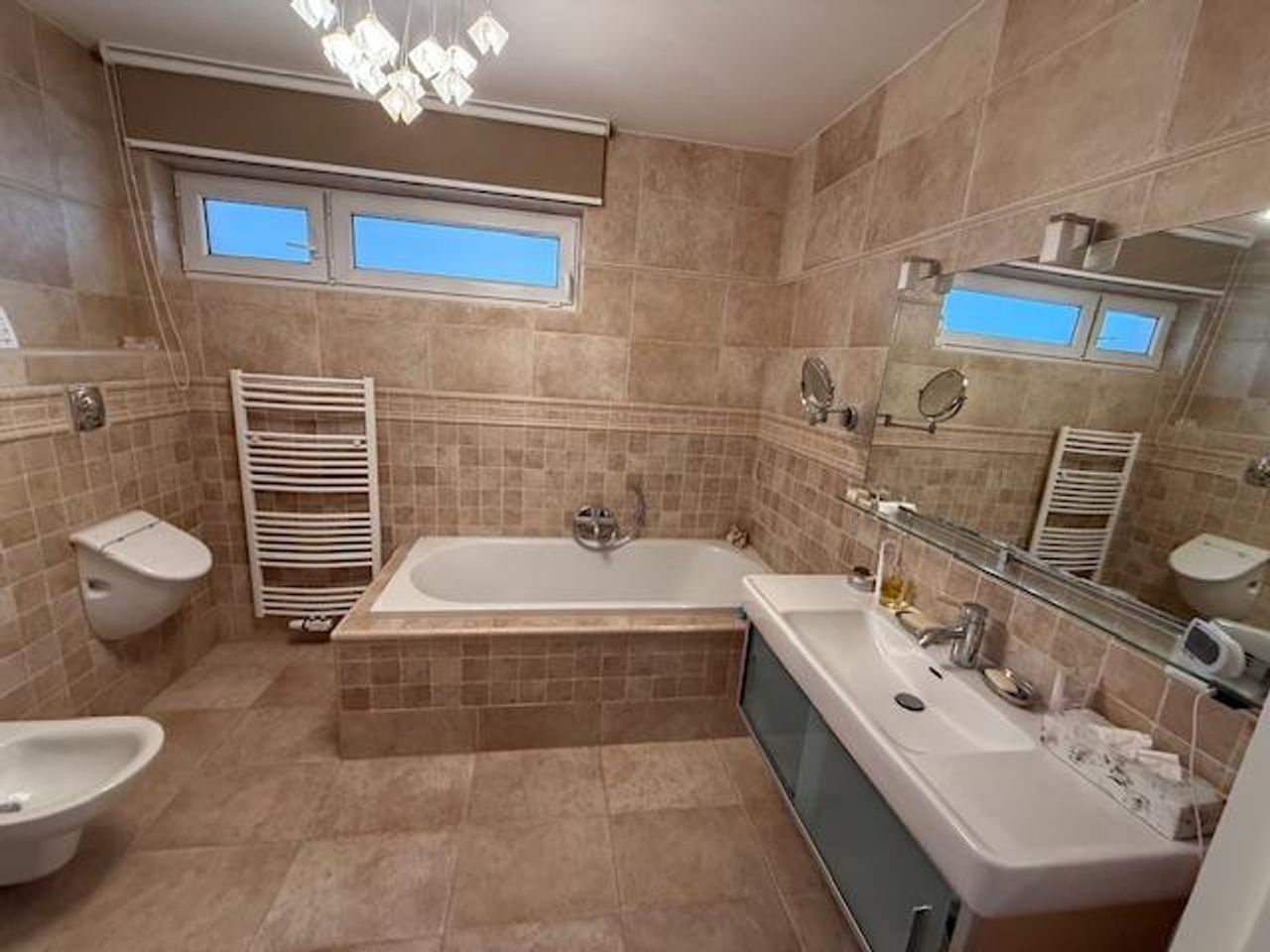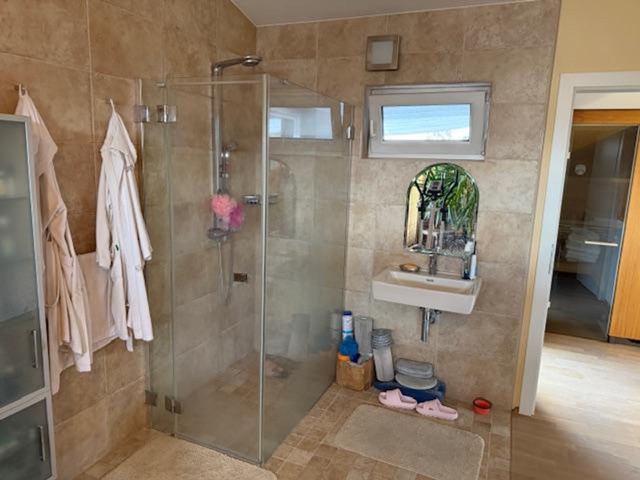 Im Obergeschoss befinden sich drei flexibel nutzbare Zimmer mit durchgehendem Balkon, hochwertigen Eichenböden sowie ein stilvoll ausgestattetes Badezimmer mit italienischen Fliesen, Bidet und Pissoir. Das Dachgeschoss bildet das private Highlight der Immobilie: ein exklusives Studio mit KLAFS-Sauna, Dusche und direktem Zugang zur ca. 37 m² großen, überdachten Dachterrasse mit Whirlpool und eindrucksvollem Blick auf den Schöckl. Ergänzt wird das Raumangebot durch einen ca. 40 m² großen, beheizten Dichtbetonkeller sowie einen liebevoll angelegten Garten mit Obstbäumen und hochwertigen Nebenflächen.