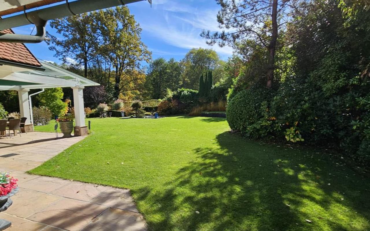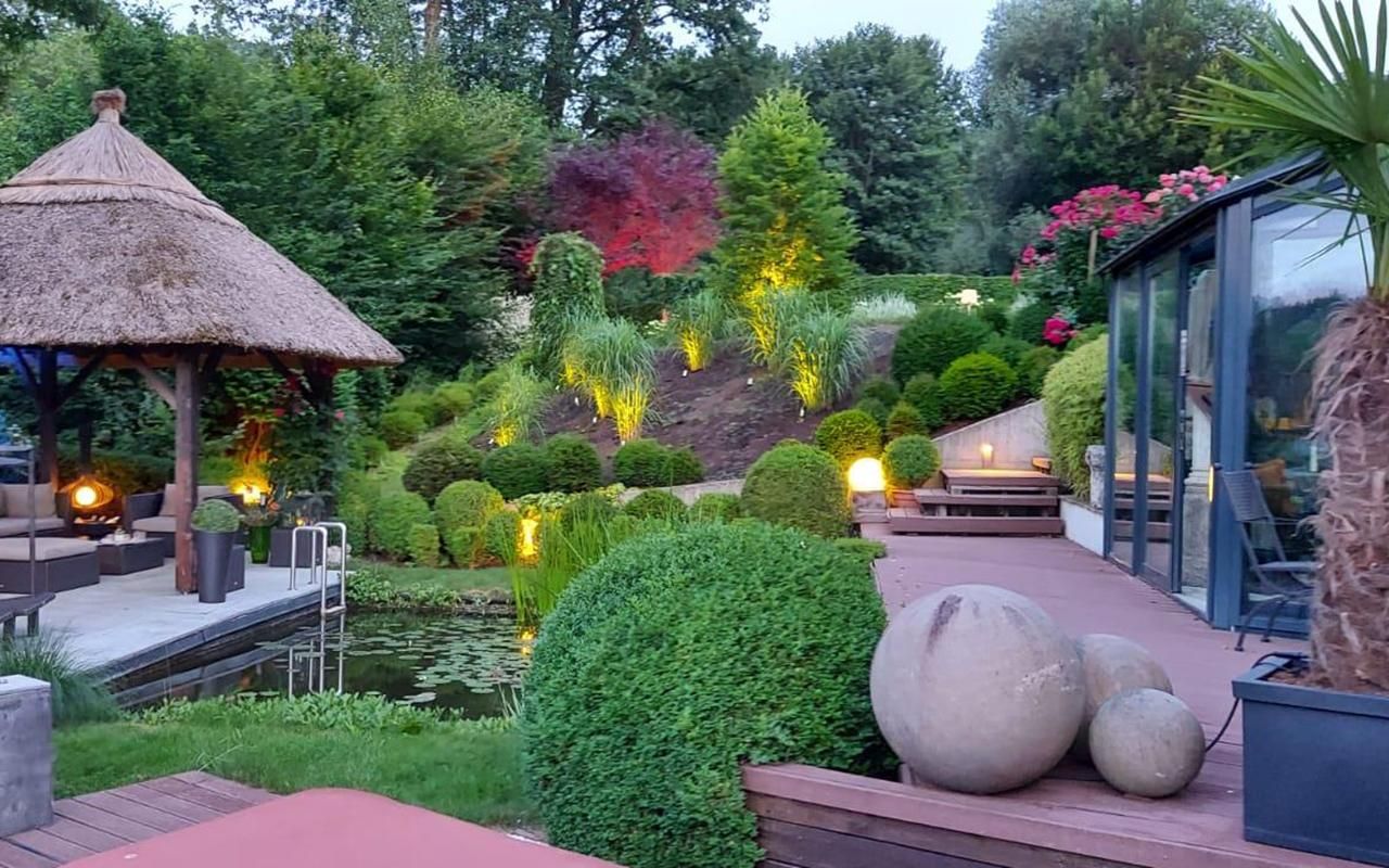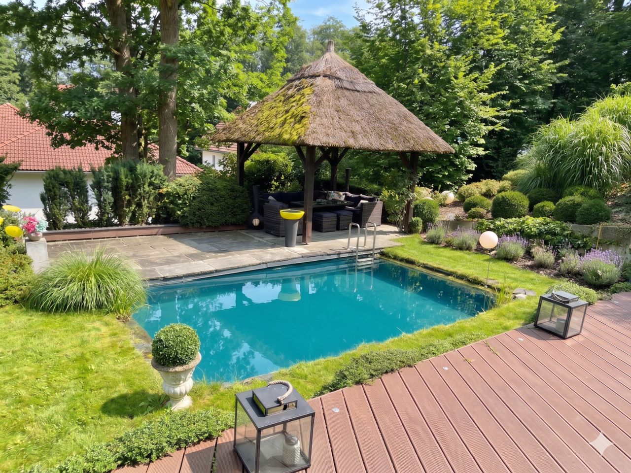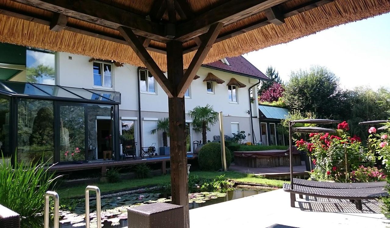 Der Außenbereich ist integraler Bestandteil des Wohnkonzepts: Balihütte, Sonnenschirm-Terrasse, weitläufige Gartenflächen sowie Wasser- und Ruhebereiche schaffen eine Atmosphäre, die täglich an Urlaub erinnert. Vollautomatische Bewässerung und Rasenpflege sorgen dabei für maximalen Komfort. Eine gepflasterte Doppelgarage, auch repräsentativ als Empfang nutzbar, rundet das Anwesen stimmig ab.