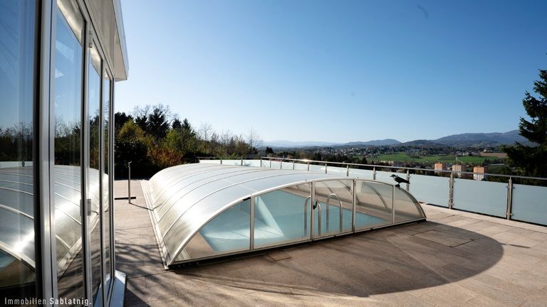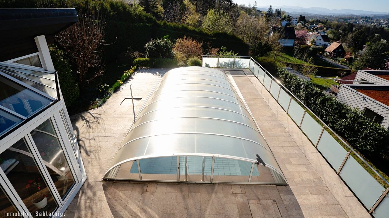Sie schwimmen im Pool, genießen das beeindruckende Panorama und sind dabei vollkommen uneinsehbar. Diese seltene Kombination aus Weitblick und Privatsphäre verleiht der Immobilie eine ganz besondere Qualität. Der Blick reicht weit in die Ferne und schafft ein offenes, freies Wohngefühl – ein Ort, an dem Ruhe, Sonne und Aussicht perfekt zusammenspielen.