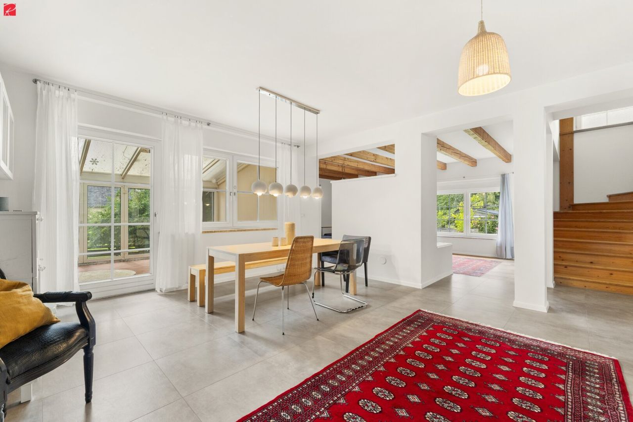 Schon beim Betreten offenbart sich die durchdachte Architektur dieser Immobilie. Großzügige Glasflächen und die Süd-West-Ausrichtung sorgen für eine außergewöhnliche Lichtdurchflutung im gesamten Wohnbereich. Die geräumige Küche erfüllt sämtliche Koch- und Backträume – ideal für gemeinsames Backen mit den Kindern oder gesellige Abende mit Freunden. Von hier aus gelangen Sie sowohl in die anliegende Speisekammer, als auch in den Keller und zu einer zweiten Gartentür – praktisch, funktional und familienfreundlich durchdacht! Der großzügige Essbereich, der in den südlich angrenzenden Wintergarten führt, bietet ausreichend Platz für einen großen Familientisch – der perfekte Mittelpunkt für gemeinsame Mahlzeiten, Feste und vielen Familien-Momenten! Das Wohnzimmer präsentiert sich privat und dennoch wunderbar offen – mit einer beeindruckenden Raumhöhe von 3,20 Metern.