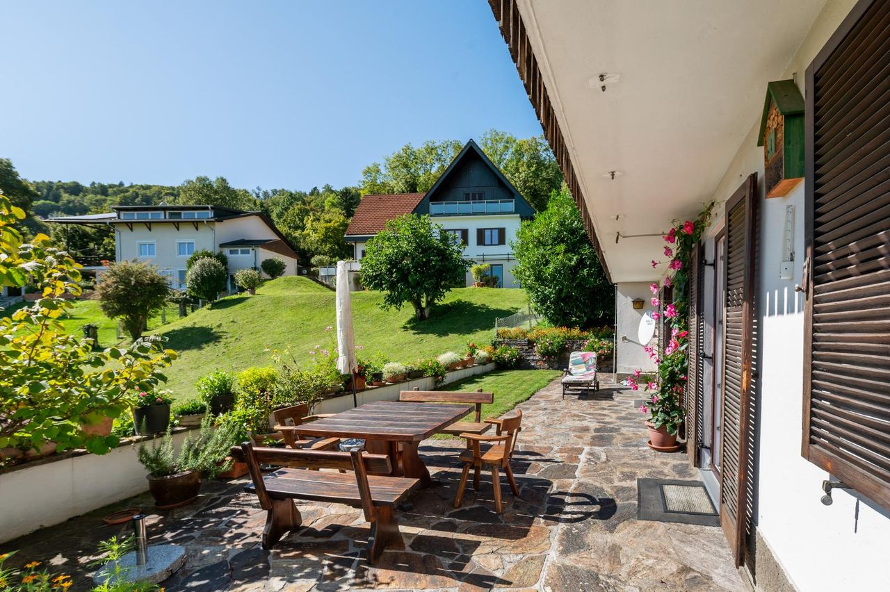 Die Liegenschaft befindet sich in leichter Hanglage, wodurch sich von den zwei Balkonen ein atemberaubender Blick über Graz sowie zur Kirche St. Johann und Paul eröffnet. Im Jahr 1967 wurde es durch einen Zubau mit südseitig ausgerichteter Terrasse und separatem Eingang erweitert.