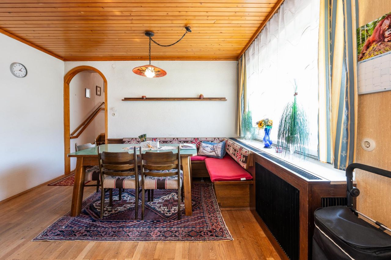 Das Obergeschoss überzeugt mit einem gemütlichen Wohn-/Essbereich, der durch den Zugang zum Balkon noch großzügiger wirkt. Ein weiteres Badezimmer sowie eine zweite Küche bieten zusätzlichen Komfort und machen diesen Bereich auch ideal für Mehrgenerationenwohnen oder eine separate Nutzung.