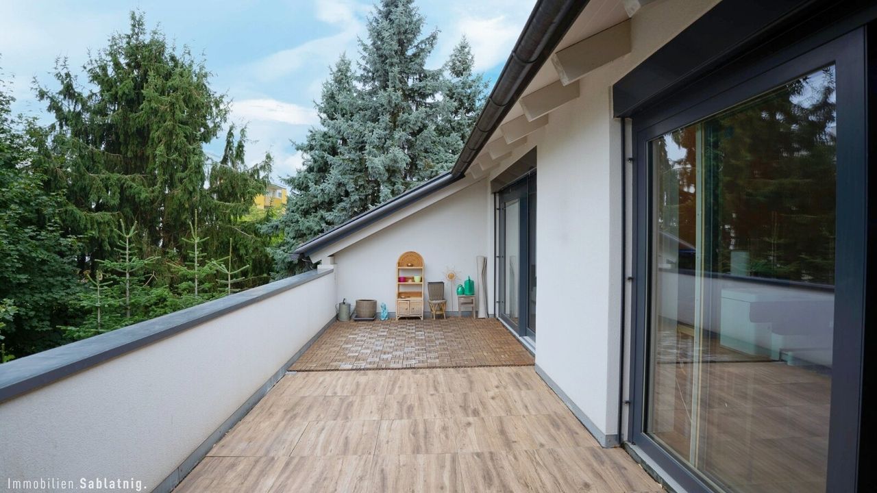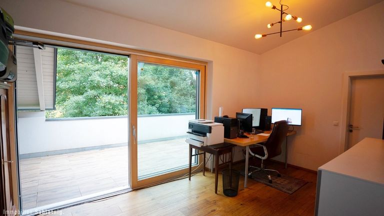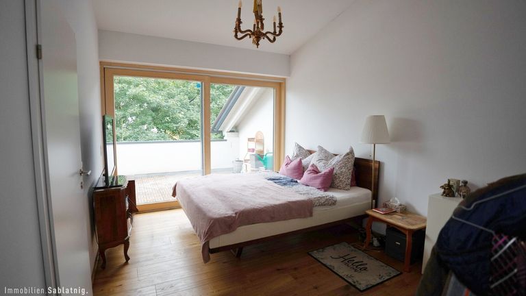 Die offene Stiege führt in die private Schlafebene. Hier erwartet Sie ein großzügiges Schlafzimmer mit weitläufigen Fensterflächen und hellem Raumgefühl. Das elegante Badezimmer verfügt über eine Glasdusche und ein WC. Ein weiteres großes Zimmer mit direktem Zugang zur Terrasse bietet zusätzlichen Freiraum – ideal als Arbeitszimmer oder persönlicher Rückzugsort.
