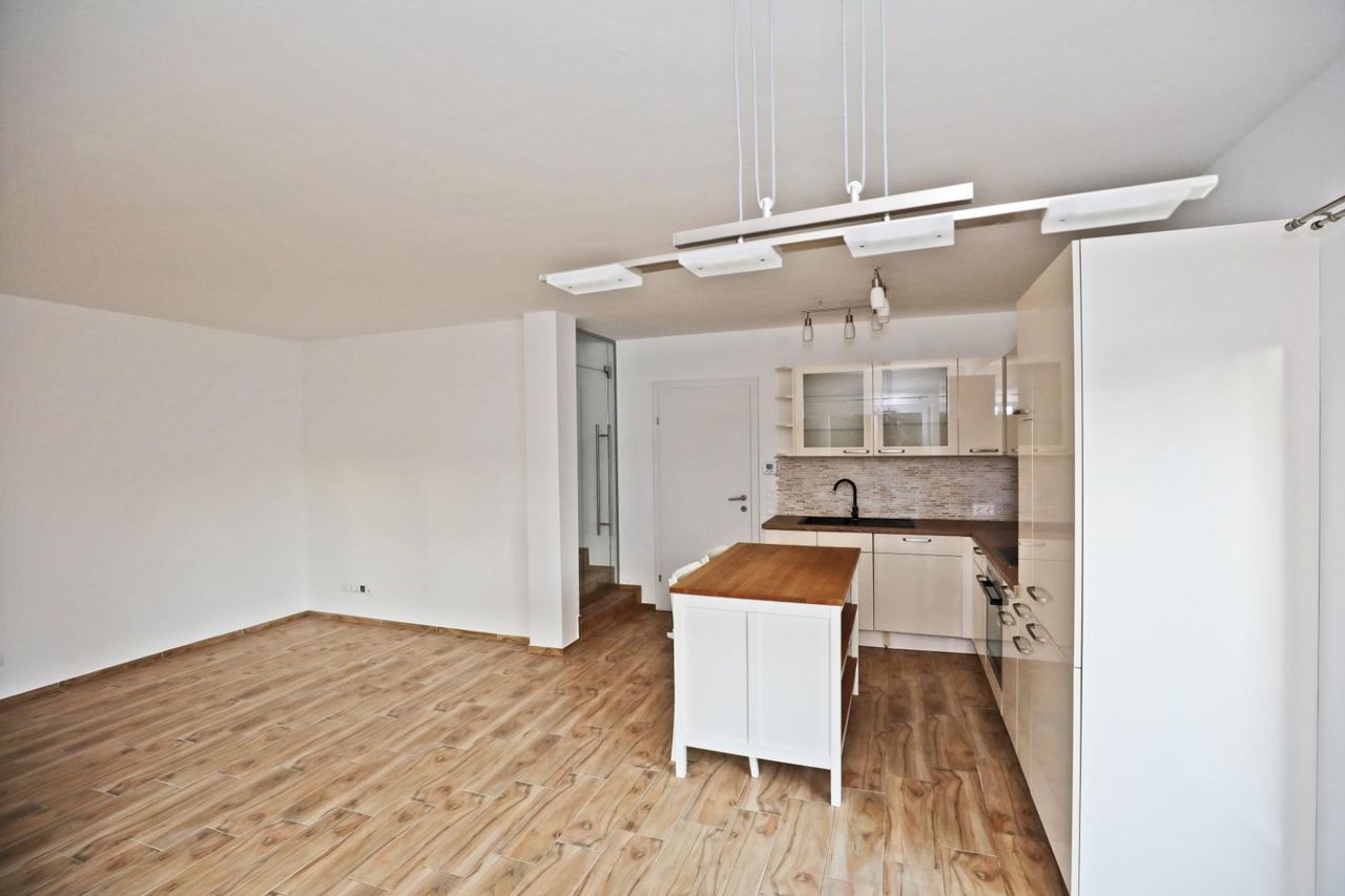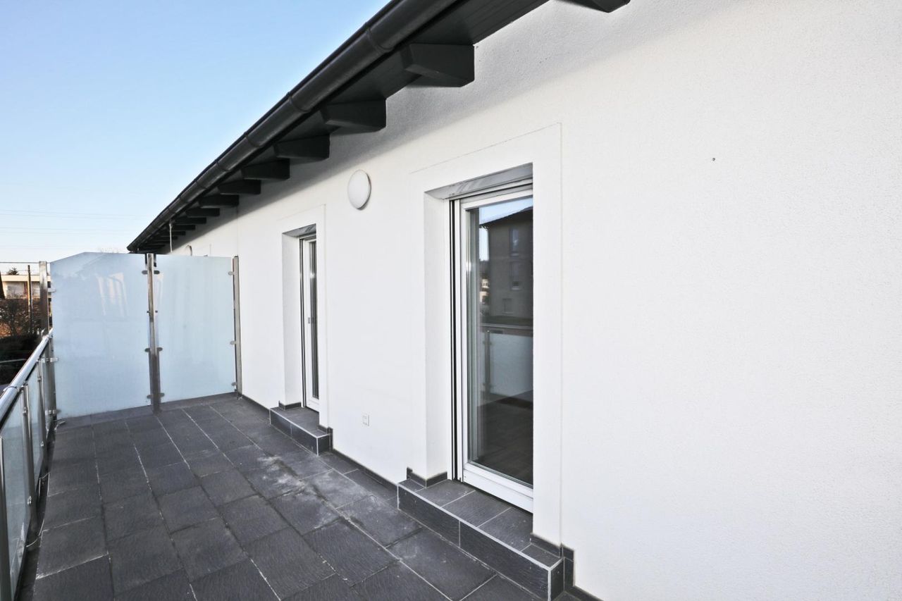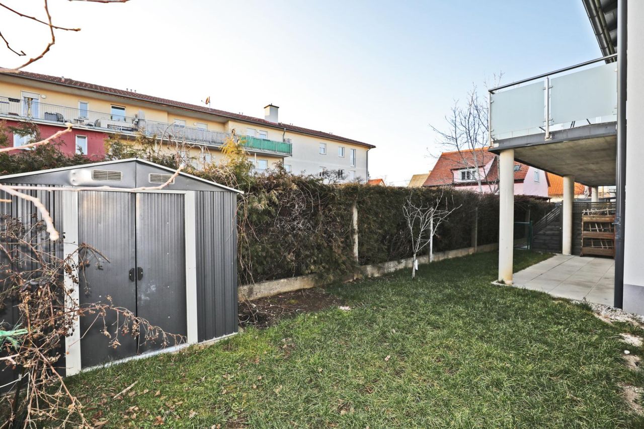 Im Erdgeschoss erwartet Sie ein heller, offener Wohn- und Essbereich mit hochwertiger Einbauküche, der direkten Zugang zur großzügigen Terrasse und in den gepflegten Eigengarten bietet. Ergänzt wird diese Ebene durch einen Technikraum, einen Abstellraum sowie ein separates WC.