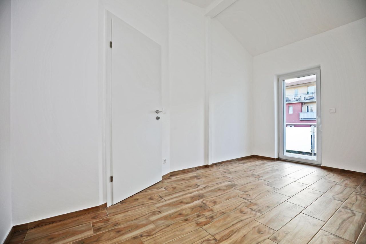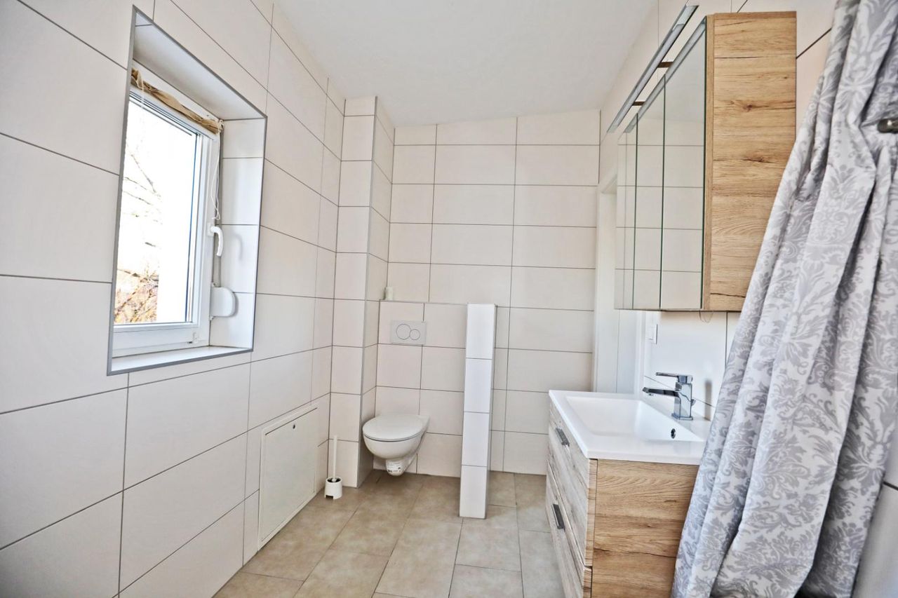 Das Obergeschoss verfügt über drei getrennt begehbare Zimmer, einen Balkon sowie ein Badezimmer mit Eckbadewanne und WC.