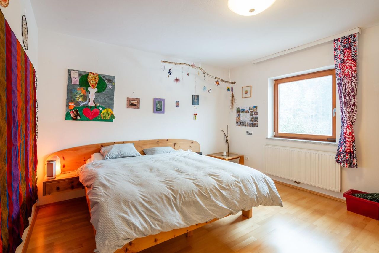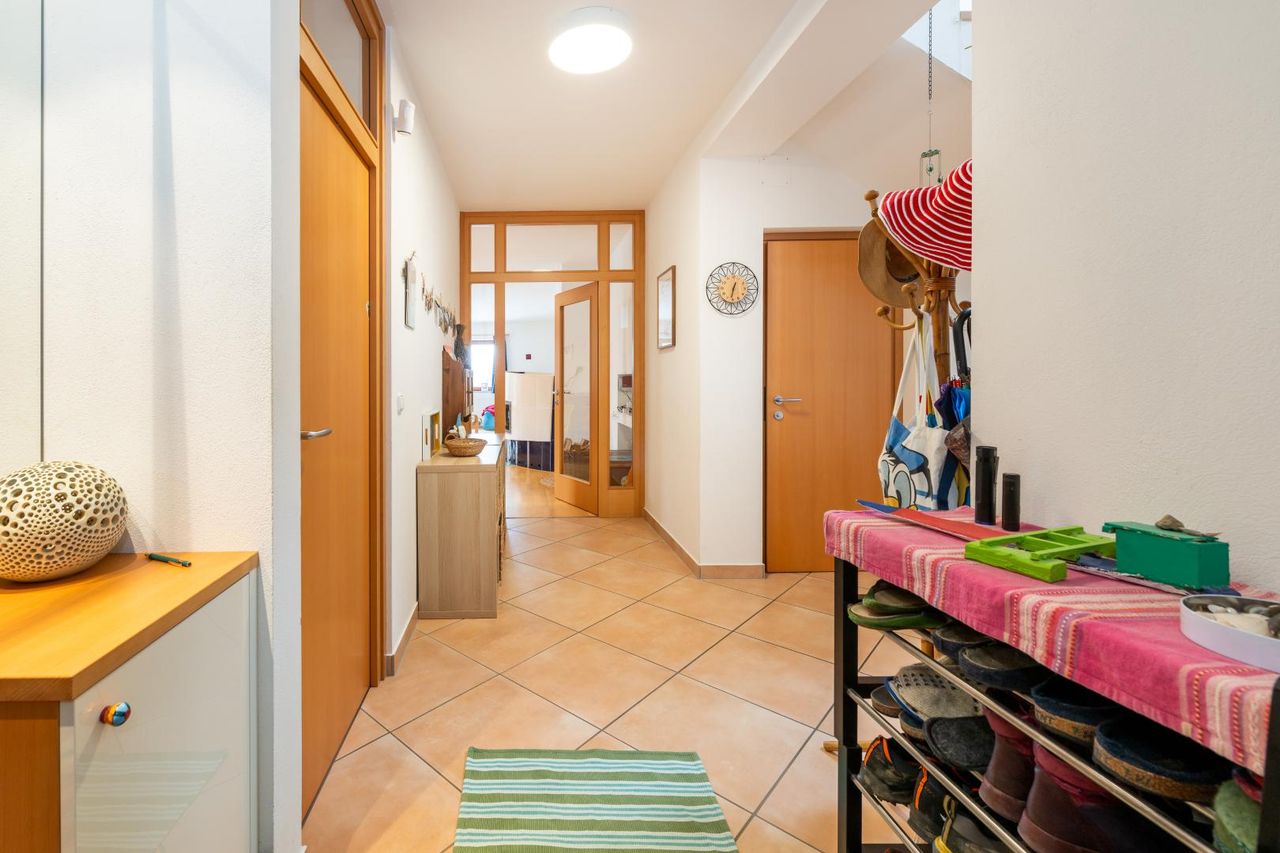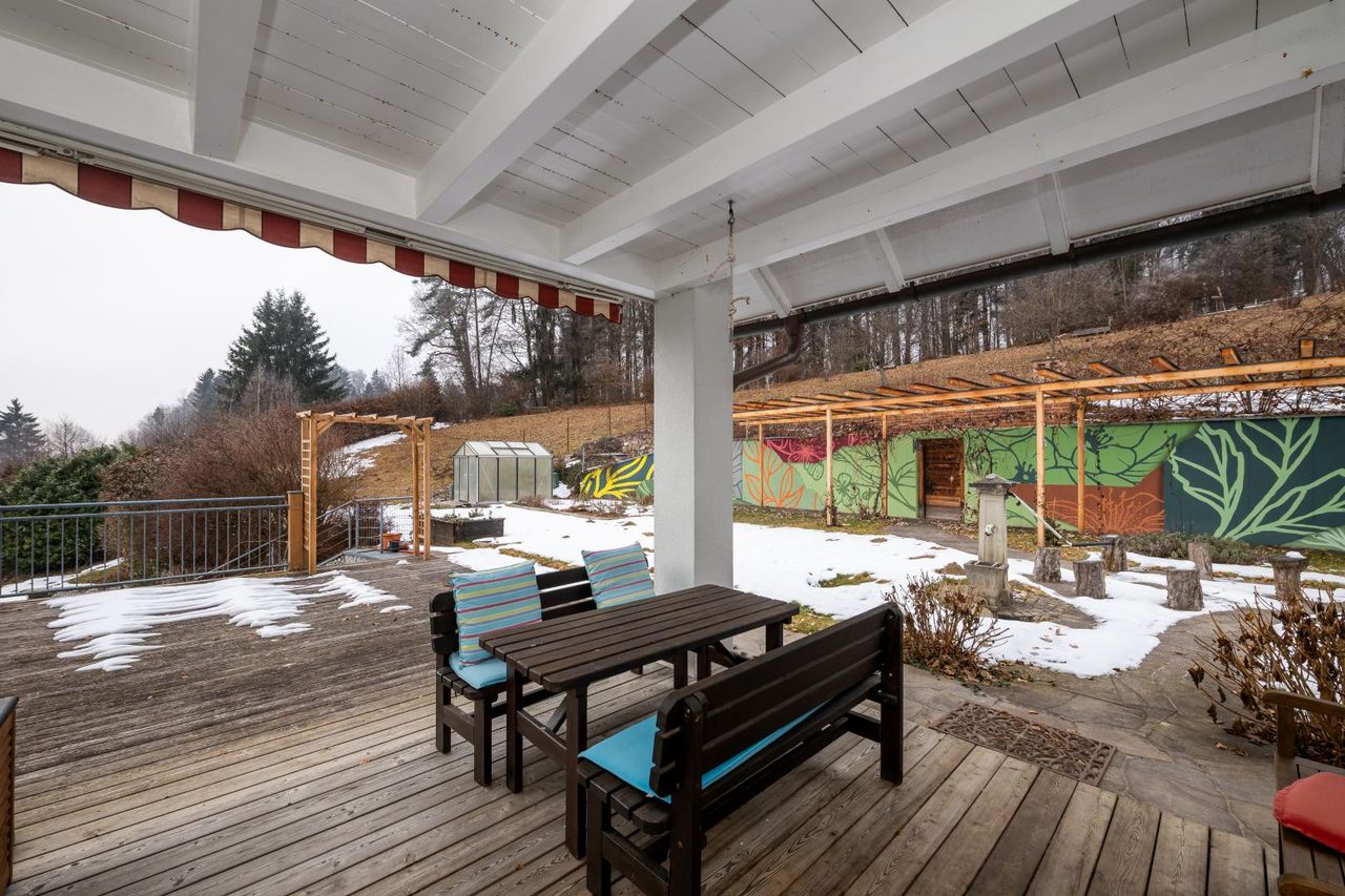 Das Haupthaus bietet insgesamt rund 221 m² Wohnfläche auf zwei Ebenen: Das Erdgeschoss bietet auf rund 114,7 m² eine einladende Wohnatmosphäre mit großzügigem Wohn-/Essbereich, moderner Tischlerküche, hochwertigem Badezimmer sowie einem separaten Gästezimmer/Büro. Vom Wohnbereich aus gelangt man direkt auf zwei große, teilweise überdachte Terrassen und zum Poolbereich. Im Obergeschoss befinden sich rund 106,7 m² Wohnfläche, aufgeteilt in 5 helle Zimmer, ein weiteres Badezimmer sowie eine Loggia mit traumhaftem Grünblick. Eine Klimaanlage im Schlafzimmer sorgt auch an heißen Tagen für angenehmes Wohnklima.