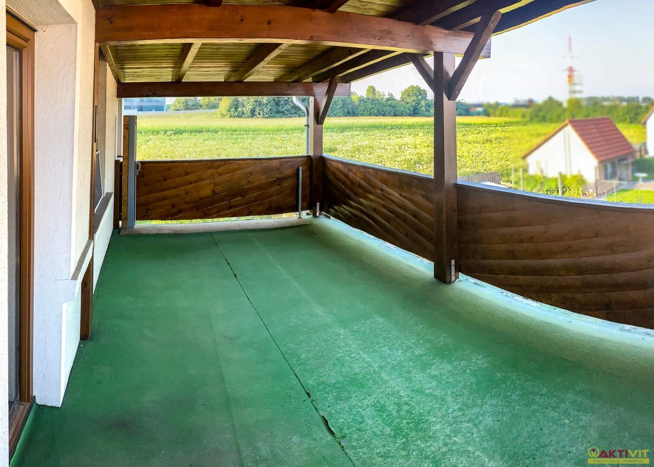 Im Obergeschoss sind ein weiteres Wohnzimmer bzw. Zimmer, ein Schlafzimmer, eine Küche, ein Badezimmer und ein getrenntes WC über einen zentralen Flur verbunden. Von der Küche gelangt man in das zweite Wohnzimmer. Ein Balkon ergänzt das Raumangebot auf dieser Etage.