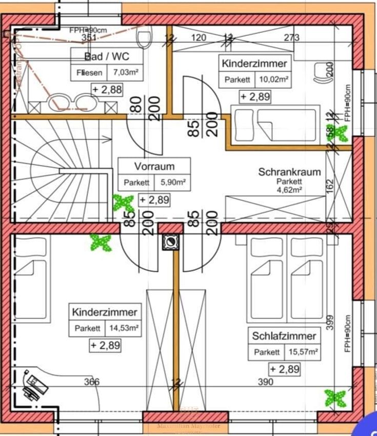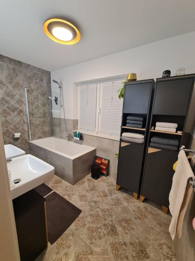 Die Schlafräume im Obergeschoss bieten gut geschnittene Rückzugsbereiche für Familie oder Gäste. Die beiden Badezimmer sind hochwertig ausgeführt und verfügen über Fenster, Dusche sowie Badewanne. Die Kombination aus funktionaler Planung und zeitloser Ausstattung verleiht dem Haus seinen modernen, zugleich wohnlichen Charakter.