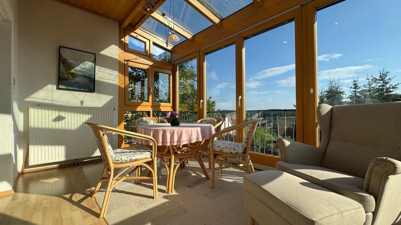 Direkt vom Wohnzimmer aus gelangt man in den Wintergarten, der einen herrlichen Blick auf den gemütlichen Garten freigibt – ein Rückzugsort für Naturliebhaber, ideal zum Entspannen, Verweilen und gemeinsame Grillabende.