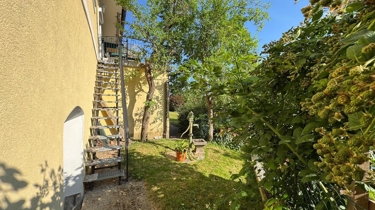 Der liebevoll angelegte Garten besticht durch seinen alten Baumbestand, geschützte Rückzugsorte und sonnige Grünflächen, die eine ganz besondere Atmosphäre schaffen.