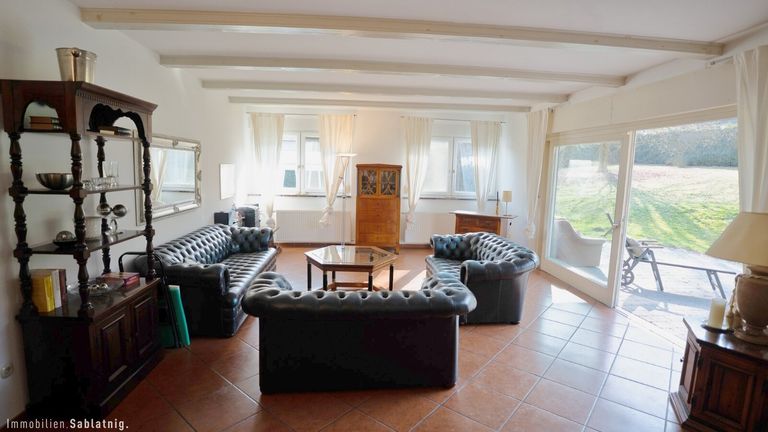 Die Südwest-Terrasse lädt zum Verweilen und Entspannen ein. Von hier genießt man einen wunderschönen Blick ins Grüne sowie auf den großzügigen Swimmingpool mit begehbarer Überdachung, der nahezu wetterunabhängig genutzt werden kann und den Freizeitwert dieser Liegenschaft deutlich erhöht.
