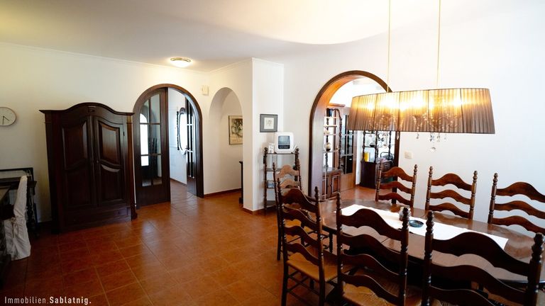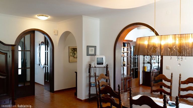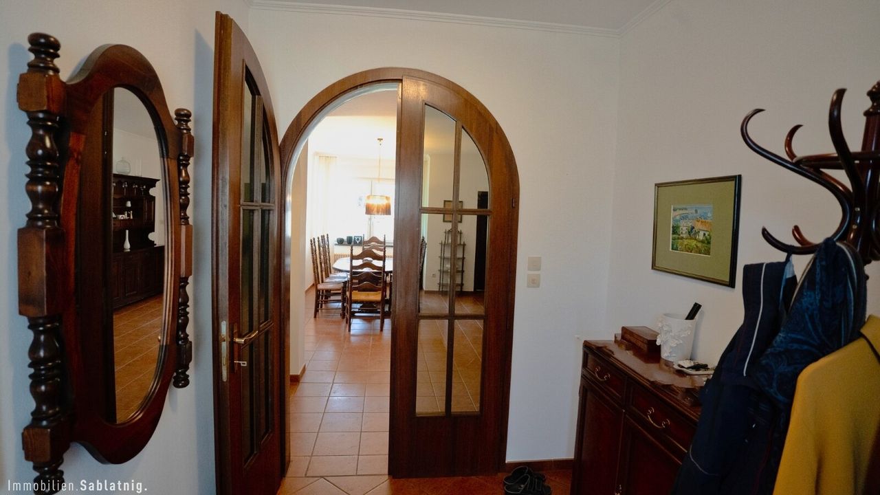 Bereits beim Betreten des Hauses entsteht ein besonderer erster Eindruck. Das Entrée öffnet sich unmittelbar zu einem beeindruckend großzügigen Essbereich, der als zentraler Mittelpunkt des Hauses gestaltet ist. Von hier aus entsteht eine harmonische Blickführung durch den gesamten Wohnbereich bis hinaus in den Garten, wodurch sofort ein Gefühl von Weite, Licht und Offenheit entsteht.