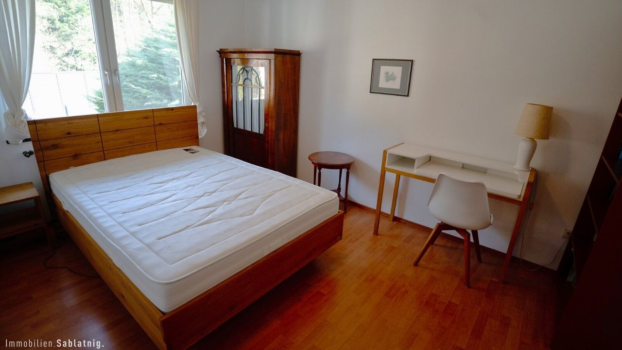 Vom zentral gelegenen Essbereich erschließen sich die weiteren hellen Räumlichkeiten des Hauses. Über einen Zwischenbereich gelangt man in den ruhig gelegenen Schlafbereich mit einem großzügigen Schlafzimmer sowie einem weiteren Zimmer, das derzeit als Ankleide genutzt wird. Ein weiteres sehr geräumiges und lichtdurchflutetes Schlafzimmer ergänzt die durchdachte Raumaufteilung.