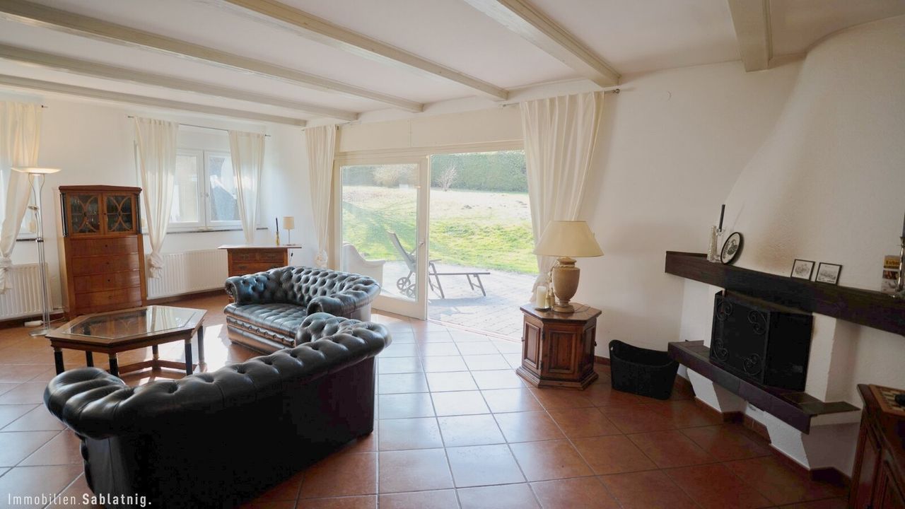 Der offene Wohn- und Essbereich bildet das Herzstück des Hauses. Große Fensterflächen, stilvolle Terrakottafliesen und der direkte Zugang zur Terrasse schaffen eine besonders warme und einladende Wohnatmosphäre. Der Wohnbereich präsentiert sich außergewöhnlich großzügig und bietet herrliche Grünblicke in den Garten. Ein Kamin im Wohnbereich sorgt zusätzlich für eine besonders angenehme Wohnatmosphäre und unterstreicht den behaglichen Charakter dieses großzügigen Raumes.