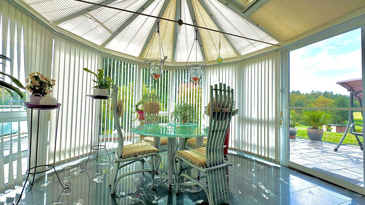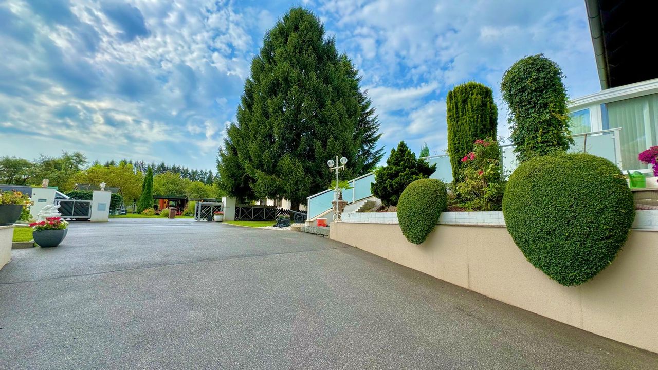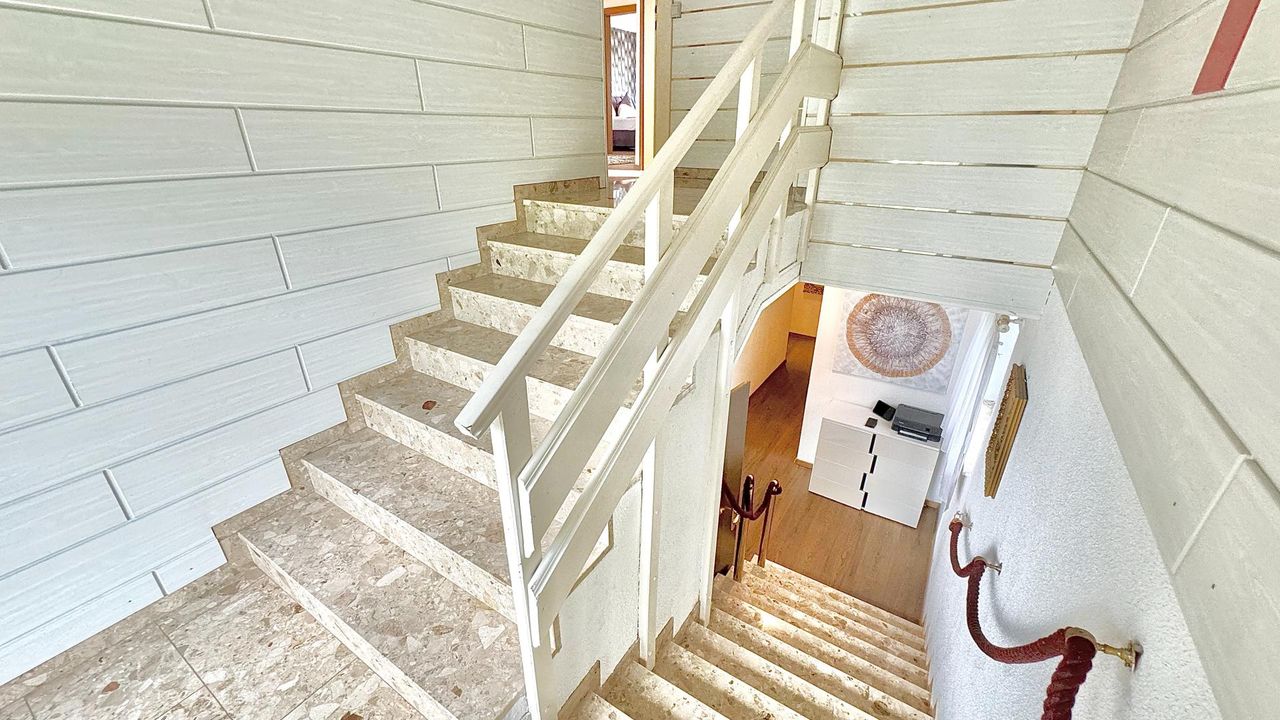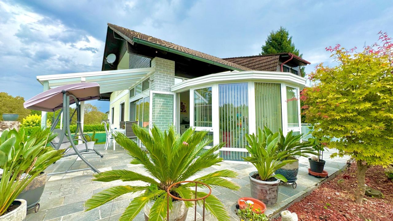 AUSSTATTUNG: Auf einem wunderschön eingewachsenen, nach Südwest ausgerichteten 1.652 m² großem Grundstück wurde im Jahr 1983 eine imposantes Ein- / Zweifamilienwohnhaus mit einer exzellenten Ausstattung und grundsolider Bausubstanz errichtet. Die clevere Grundrissgestaltung und der gemeinsam genutzte, offene Eingangsbereich macht es bei Bedarf möglich, aus dem genutzten Zweifamilienhaus ganz einfach ein Einfamilienhaus zu gestalten. Das Erdgeschoss besteht aus einem komfortablen Wohn-/ Esszimmerzimmer mit angrenzenden Wintergarten, zwei Schlafzimmer, ein rund 20 m² großes Badezimmer, eine separate Toilette mit Waschbecken und einer modernen erst 2023 neu eingebauten Küche, die mit Top-Markeneinbaugeräten ausgestattet ist. Das Highlight des Erdgeschosses ist der großzügige Wohnbereich und das...