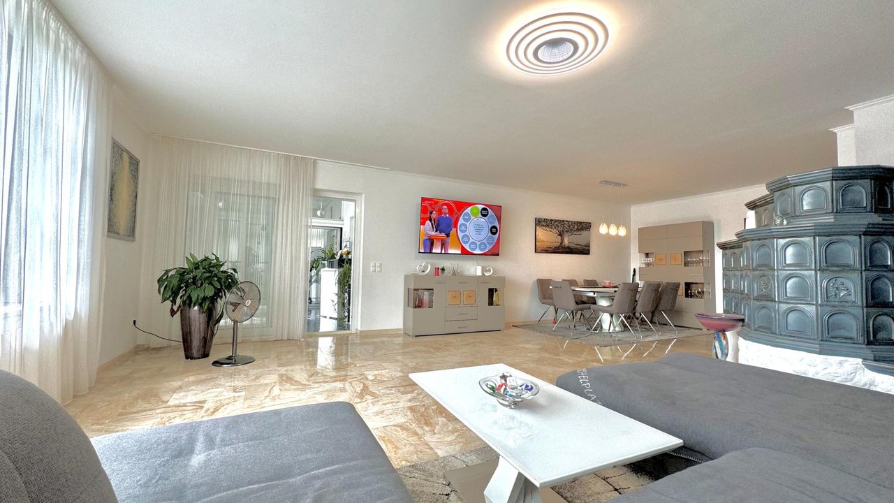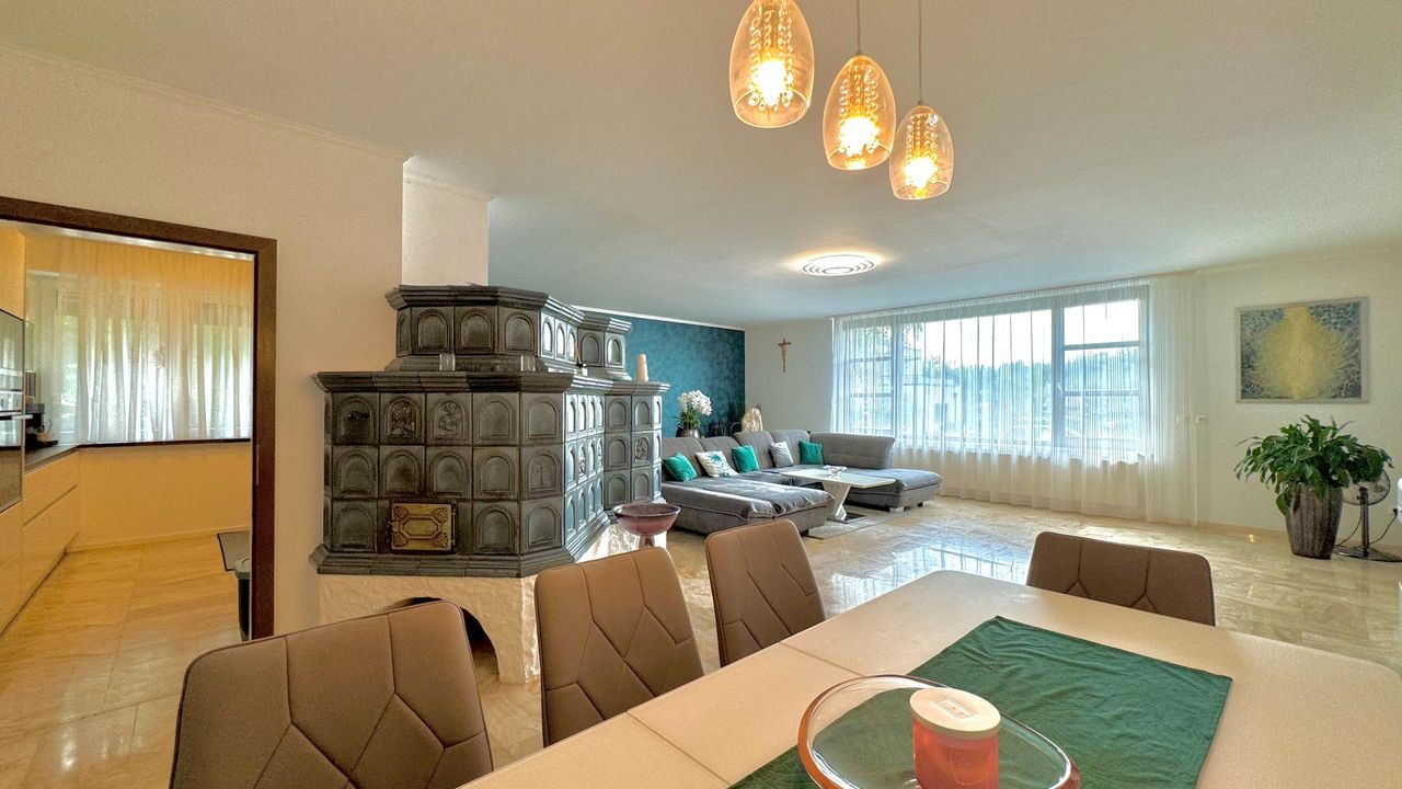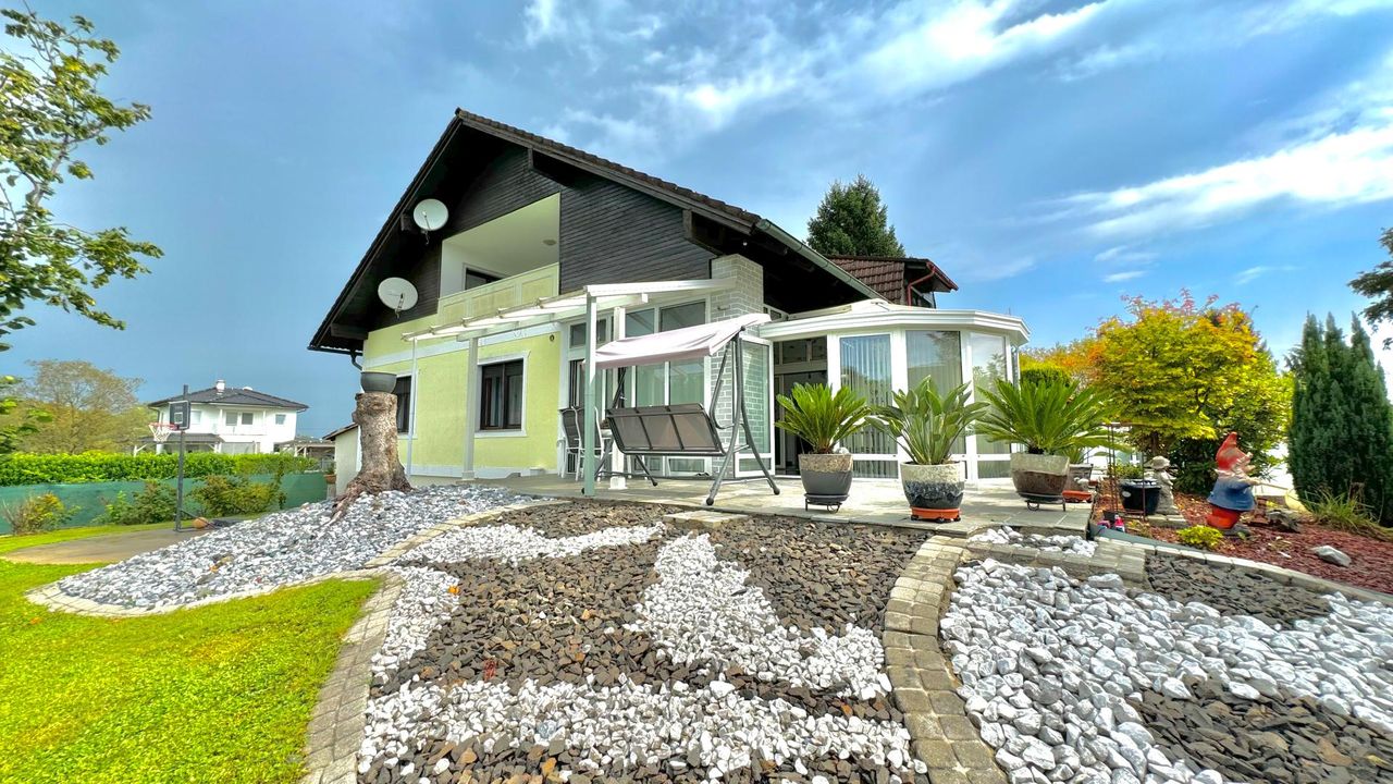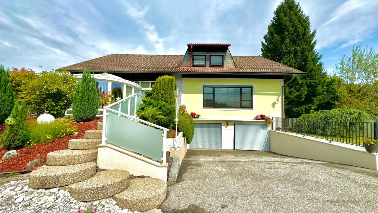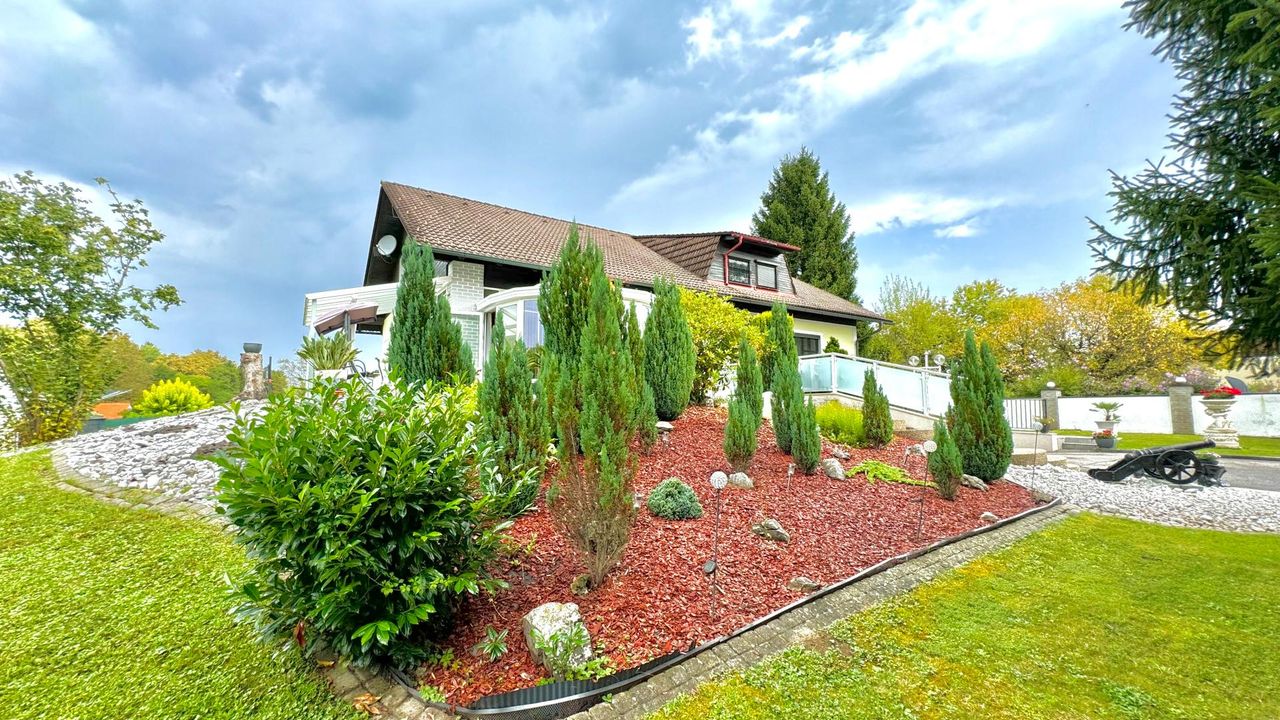 Auf einem wunderschön eingewachsenen, nach Südwest ausgerichteten 1.652 m² großem Grundstück wurde im Jahr 1983 eine imposantes Ein- / Zweifamilienwohnhaus mit einer exzellenten Ausstattung und grundsolider Bausubstanz errichtet. Die clevere Grundrissgestaltung und der gemeinsam genutzte, offene Eingangsbereich macht es bei Bedarf möglich, aus dem genutzten Zweifamilienhaus ganz einfach ein Einfamilienhaus zu gestalten. Das Erdgeschoss besteht aus einem komfortablen Wohn-/ Esszimmerzimmer mit angrenzenden Wintergarten, zwei Schlafzimmer, ein rund 20 m² großes Badezimmer, eine separate Toilette mit Waschbecken und einer modernen erst 2023 neu eingebauten Küche, die mit Top-Markeneinbaugeräten ausgestattet ist. Das Highlight des Erdgeschosses ist der großzügige Wohnbereich und das sich anschließende offene Esszimmer. Einen tollen Blick auf den grünen Garten bietet der große Wintergarten sowie die angrenzende Terrasse mit süd-westlicher Ausrichtung. Von dort kann den ganzen Tag über die Sonne in vollen Zügen genossen werden! Das erst im Jahr 2018 neu ausgebaute Dachgeschoss besteht aus 1 Schlafzimmer mit angrenzender ca. 12 m² großen Loggia, einem weiteren Schlafzimmer, einem Kinderzimmer, einem Bad mit Dusche und einem separaten WC. Ein Wohn-/ Esszimmer mit eingebauter Küche runden das Angebot des ausgebauten Dachgeschosses ab. Der Vollkeller bietet zusätzlich ca. 145 m² Nutzfläche, eine eigene Waschküche, einen Heizraum, drei weitere Kellerräume und einen direkten Zugang in die großzügige Doppelgarage wo zwei Fahrzeuge Platz finden. Die Heizungsanlage wurde 2022 auf Pelletheizung erneuert.