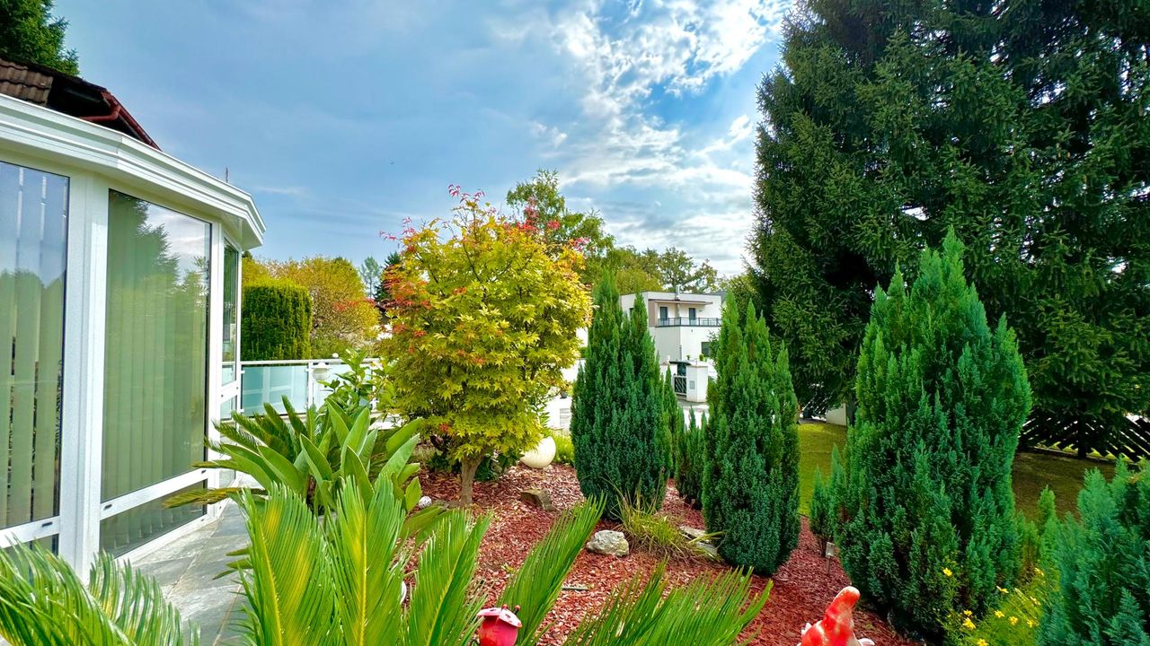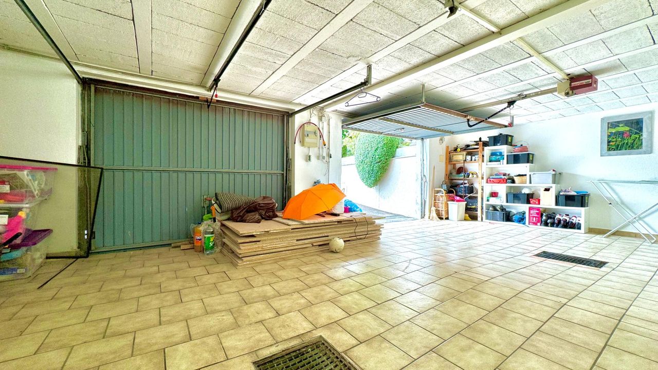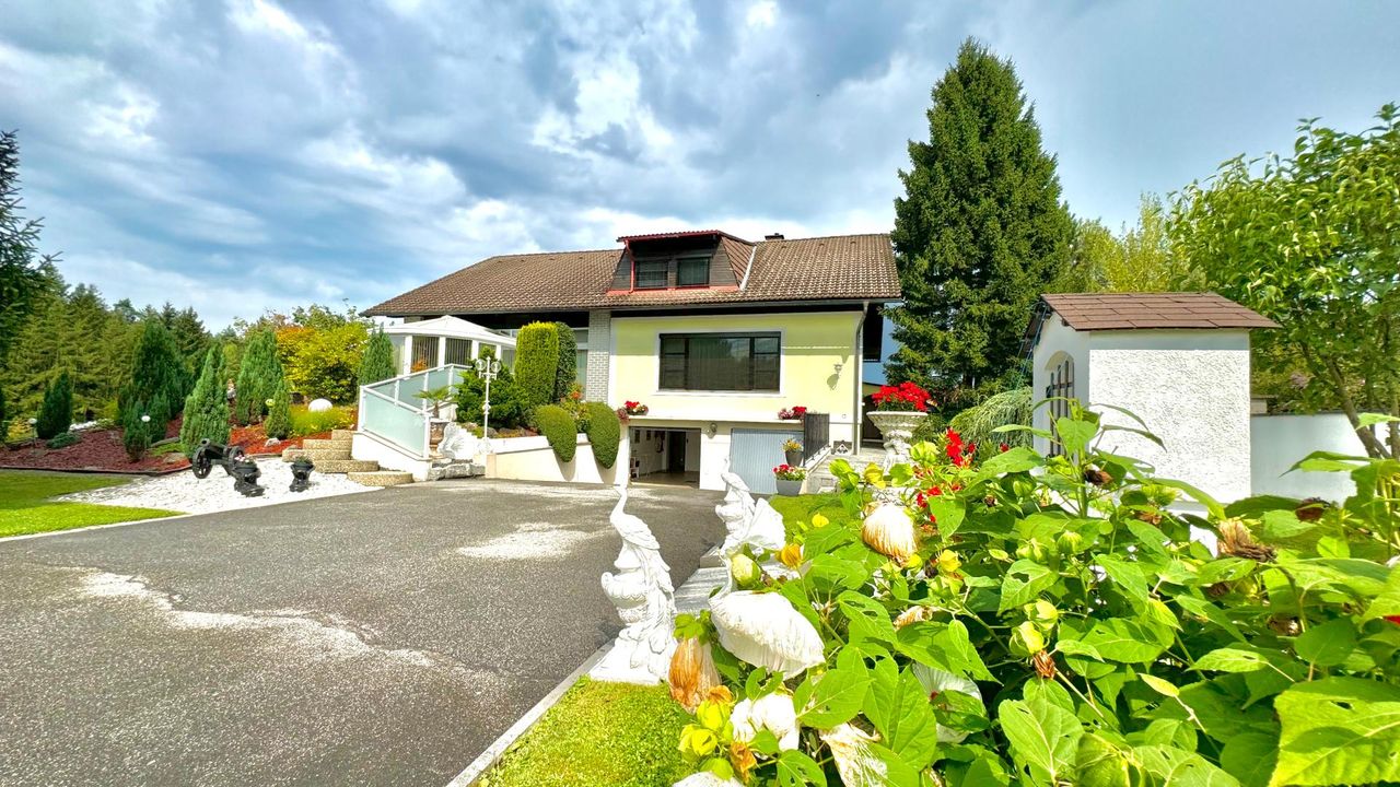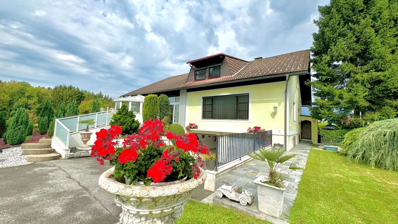 Auf einem wunderschön eingewachsenen, nach Südwest ausgerichteten 1.652 m² großem Grundstück wurde im Jahr 1983 eine imposantes Ein- / Zweifamilienwohnhaus mit einer exzellenten Ausstattung und grundsolider Bausubstanz errichtet. Die clevere Grundrissgestaltung und der gemeinsam genutzte, offene Eingangsbereich macht es bei Bedarf möglich, aus dem genutzten Zweifamilienhaus ganz einfach ein Einfamilienhaus zu gestalten. Das Erdgeschoss besteht aus einem komfortablen Wohn-/ Esszimmerzimmer mit angrenzenden Wintergarten, zwei Schlafzimmer, ein rund 20 m² großes Badezimmer, eine separate Toilette mit Waschbecken und einer modernen erst 2023 neu eingebauten Küche, die mit Top-Markeneinbaugeräten ausgestattet ist. Das Highlight des Erdgeschosses ist der großzügige Wohnbereich und das sich anschließende offene Esszimmer. Einen tollen Blick auf den grünen Garten bietet der große Wintergarten sowie die angrenzende Terrasse mit süd-westlicher Ausrichtung. Von dort kann den ganzen Tag über die Sonne in vollen Zügen genossen werden! Das erst im Jahr 2018 neu ausgebaute Dachgeschoss besteht aus 1 Schlafzimmer mit angrenzender ca. 12 m² großen Loggia, einem weiteren Schlafzimmer, einem Kinderzimmer, einem Bad mit Dusche und einem separaten WC. Ein Wohn-/ Esszimmer mit eingebauter Küche runden das Angebot des ausgebauten Dachgeschosses ab. Der Vollkeller bietet zusätzlich ca. 145 m² Nutzfläche, eine eigene Waschküche, einen Heizraum, drei weitere Kellerräume und einen direkten Zugang in die großzügige Doppelgarage wo zwei Fahrzeuge Platz finden. Die Heizungsanlage wurde 2022 auf Pelletheizung erneuert.