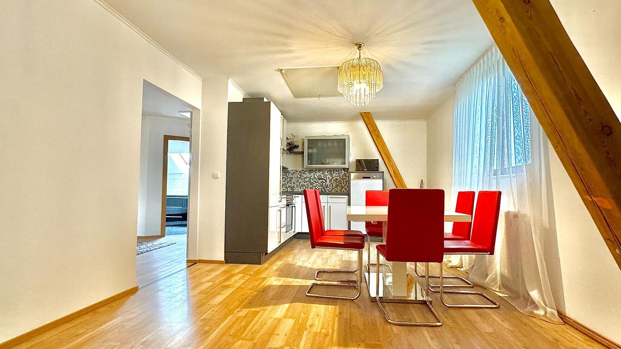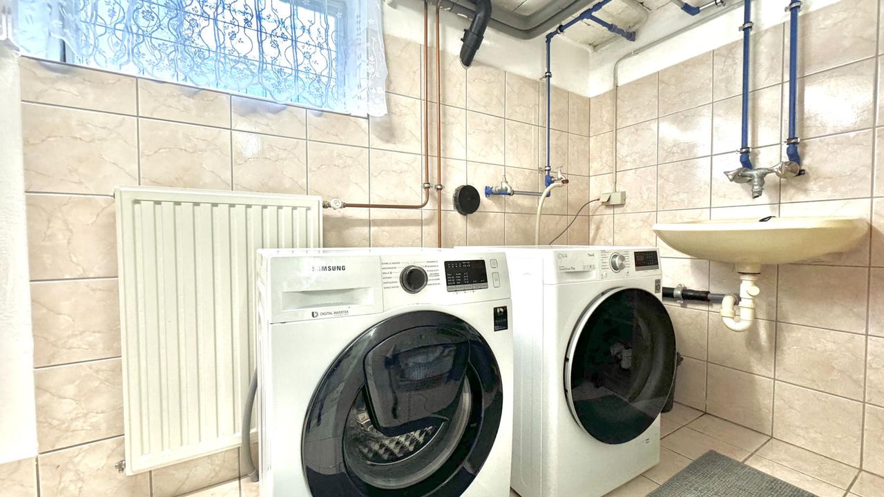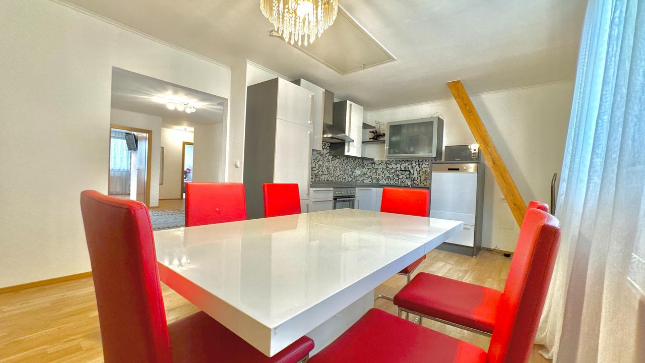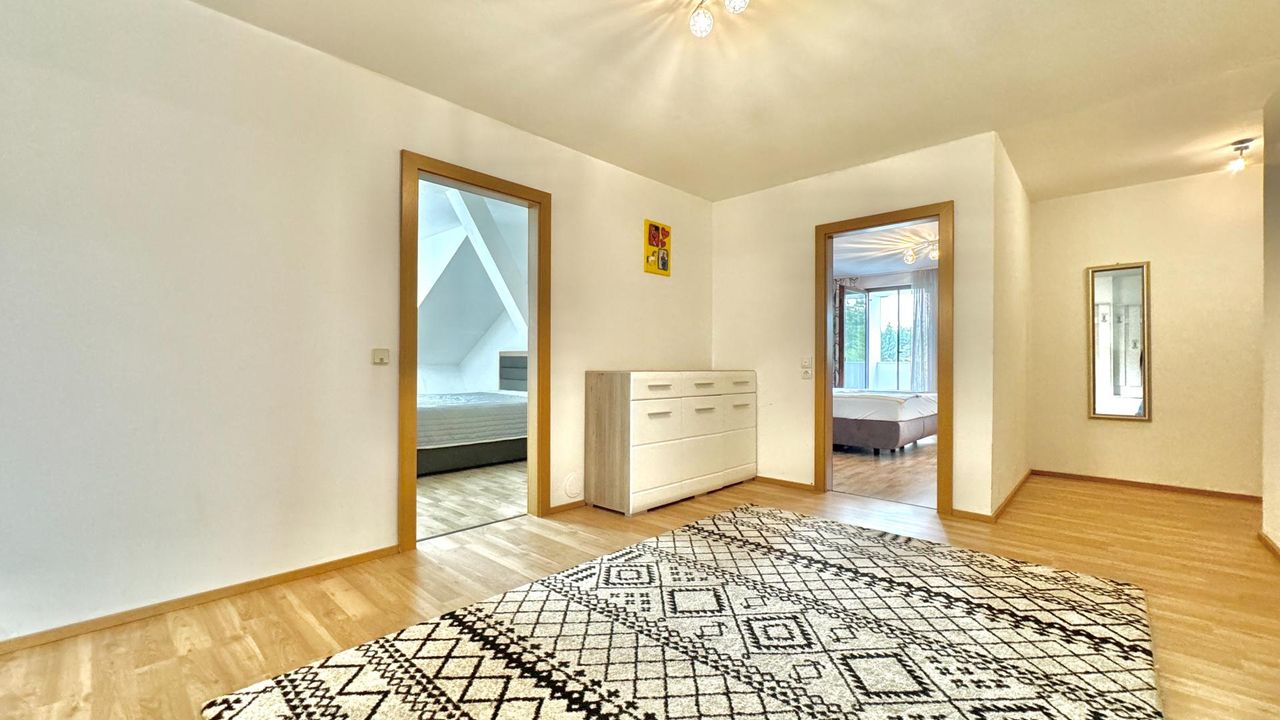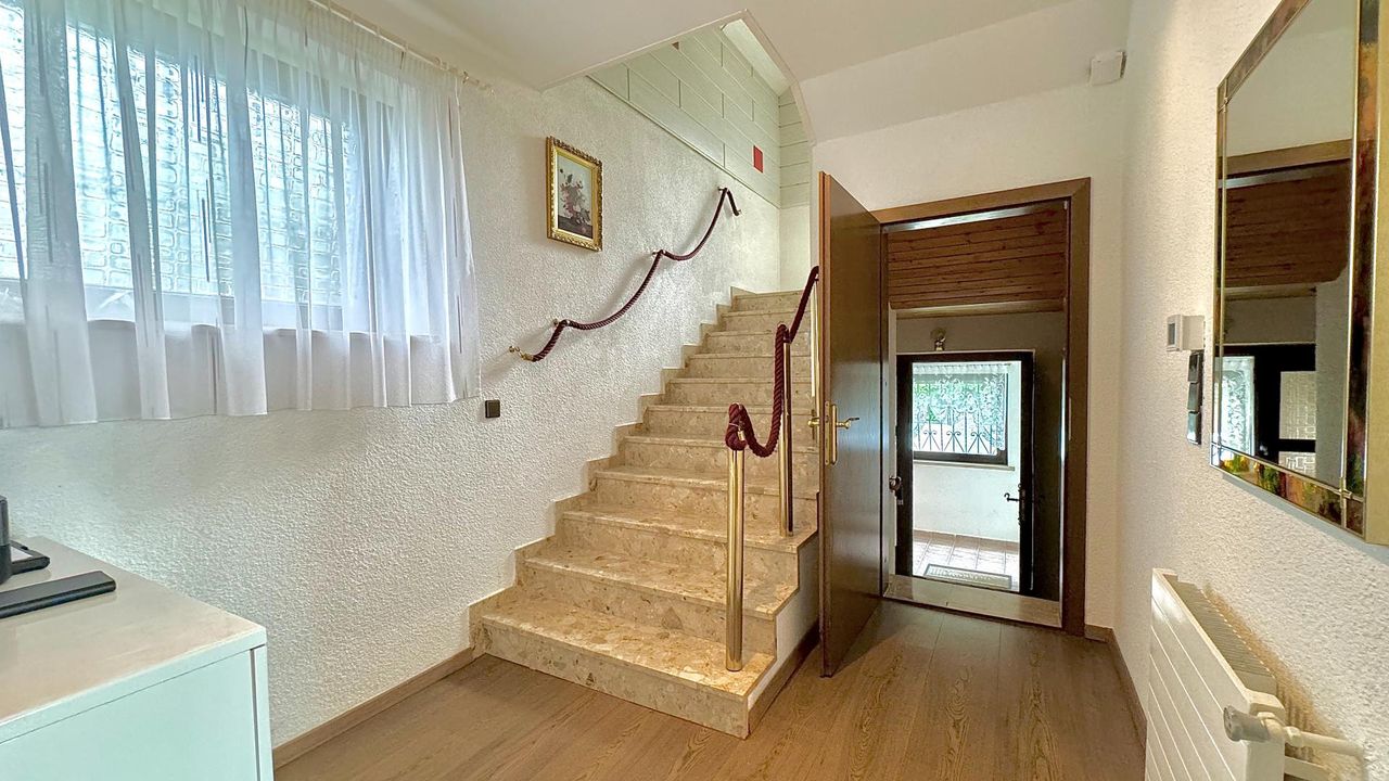 Auf einem wunderschön eingewachsenen, nach Südwest ausgerichteten 1.652 m² großem Grundstück wurde im Jahr 1983 eine imposantes Ein- / Zweifamilienwohnhaus mit einer exzellenten Ausstattung und grundsolider Bausubstanz errichtet. Die clevere Grundrissgestaltung und der gemeinsam genutzte, offene Eingangsbereich macht es bei Bedarf möglich, aus dem genutzten Zweifamilienhaus ganz einfach ein Einfamilienhaus zu gestalten. Das Erdgeschoss besteht aus einem komfortablen Wohn-/ Esszimmerzimmer mit angrenzenden Wintergarten, zwei Schlafzimmer, ein rund 20 m² großes Badezimmer, eine separate Toilette mit Waschbecken und einer modernen erst 2023 neu eingebauten Küche, die mit Top-Markeneinbaugeräten ausgestattet ist. Das Highlight des Erdgeschosses ist der großzügige Wohnbereich und das sich anschließende offene Esszimmer. Einen tollen Blick auf den grünen Garten bietet der große Wintergarten sowie die angrenzende Terrasse mit süd-westlicher Ausrichtung. Von dort kann den ganzen Tag über die Sonne in vollen Zügen genossen werden! Das erst im Jahr 2018 neu ausgebaute Dachgeschoss besteht aus 1 Schlafzimmer mit angrenzender ca. 12 m² großen Loggia, einem weiteren Schlafzimmer, einem Kinderzimmer, einem Bad mit Dusche und einem separaten WC. Ein Wohn-/ Esszimmer mit eingebauter Küche runden das Angebot des ausgebauten Dachgeschosses ab. Der Vollkeller bietet zusätzlich ca. 145 m² Nutzfläche, eine eigene Waschküche, einen Heizraum, drei weitere Kellerräume und einen direkten Zugang in die großzügige Doppelgarage wo zwei Fahrzeuge Platz finden. Die Heizungsanlage wurde 2022 auf Pelletheizung erneuert.