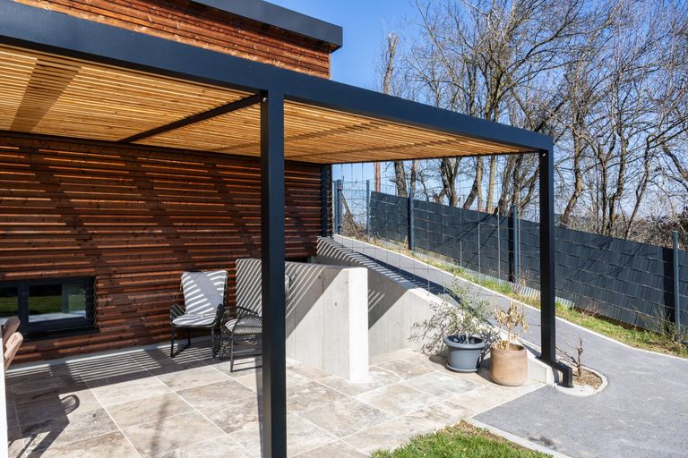 Die Architektur des Hauses wurde bewusst so entwickelt, dass sich die Wohnräume und Terrassenbereiche zur offenen Landschaft orientieren, wodurch schöne Blickachsen ins Grüne sowie ein geschützter privater Außenbereich entstehen.