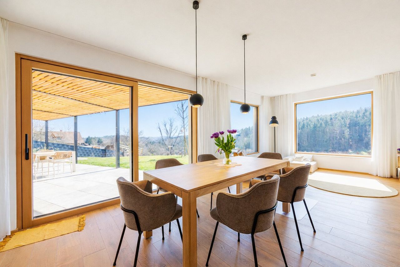 Großzügige Fensterflächen, klare Linien und hochwertige Materialien sorgen für eine zeitlose, moderne Architektur, die nicht laut sein muss, um Eindruck zu hinterlassen.