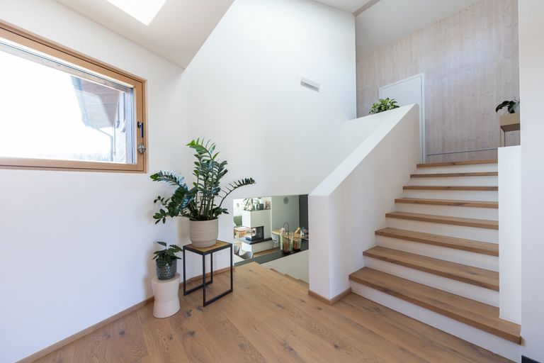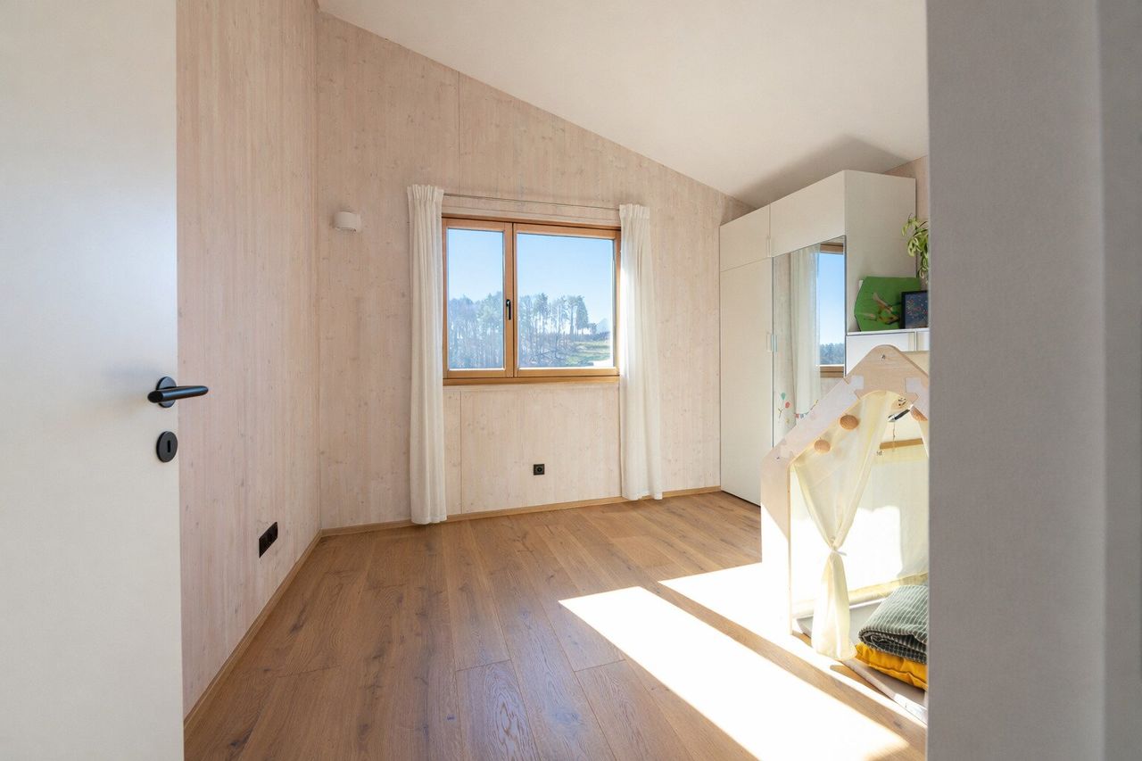Die Kombination aus Ziegelmassivbau im Erdgeschoss und sichtbaren CLT-Massivholzwänden im Obergeschoss schafft ein außergewöhnlich angenehmes Raumklima.