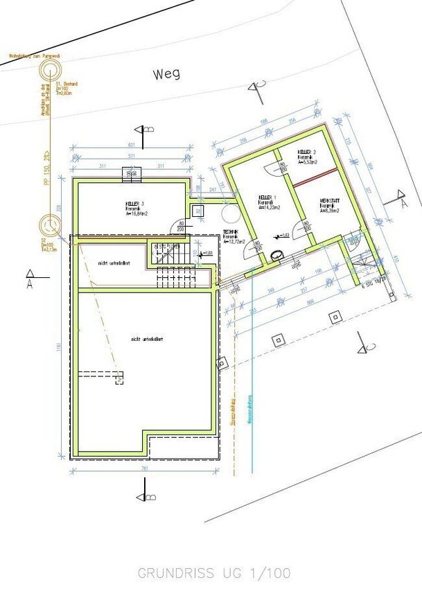 ca. 60 m² Keller, gefliest und in mehrere Räume gegliedert