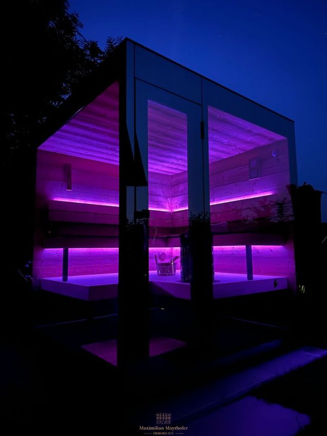 Ein besonderes Highlight der Immobilie ist der private Wellnessbereich: Die spiegelverglaste Outdoor-Sauna, der Whirlpool im Außenbereich sowie ein hochwertig ausgestattetes Badezimmer mit Dampfduschkabine schaffen einen Ort der Entspannung in absoluter Privatsphäre. Ergänzt wird das Raumangebot durch eine Garage im Untergeschoss sowie mehrere Freistellplätze.