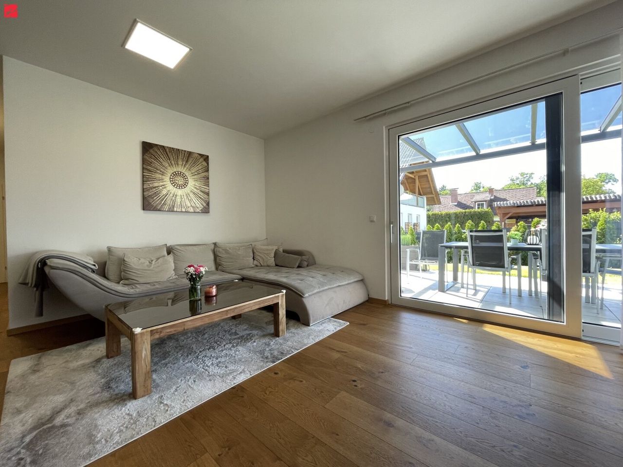 + 28 m² sonnige und überdachte Terrasse mit begehbaren Glasdach und Sonnensegel