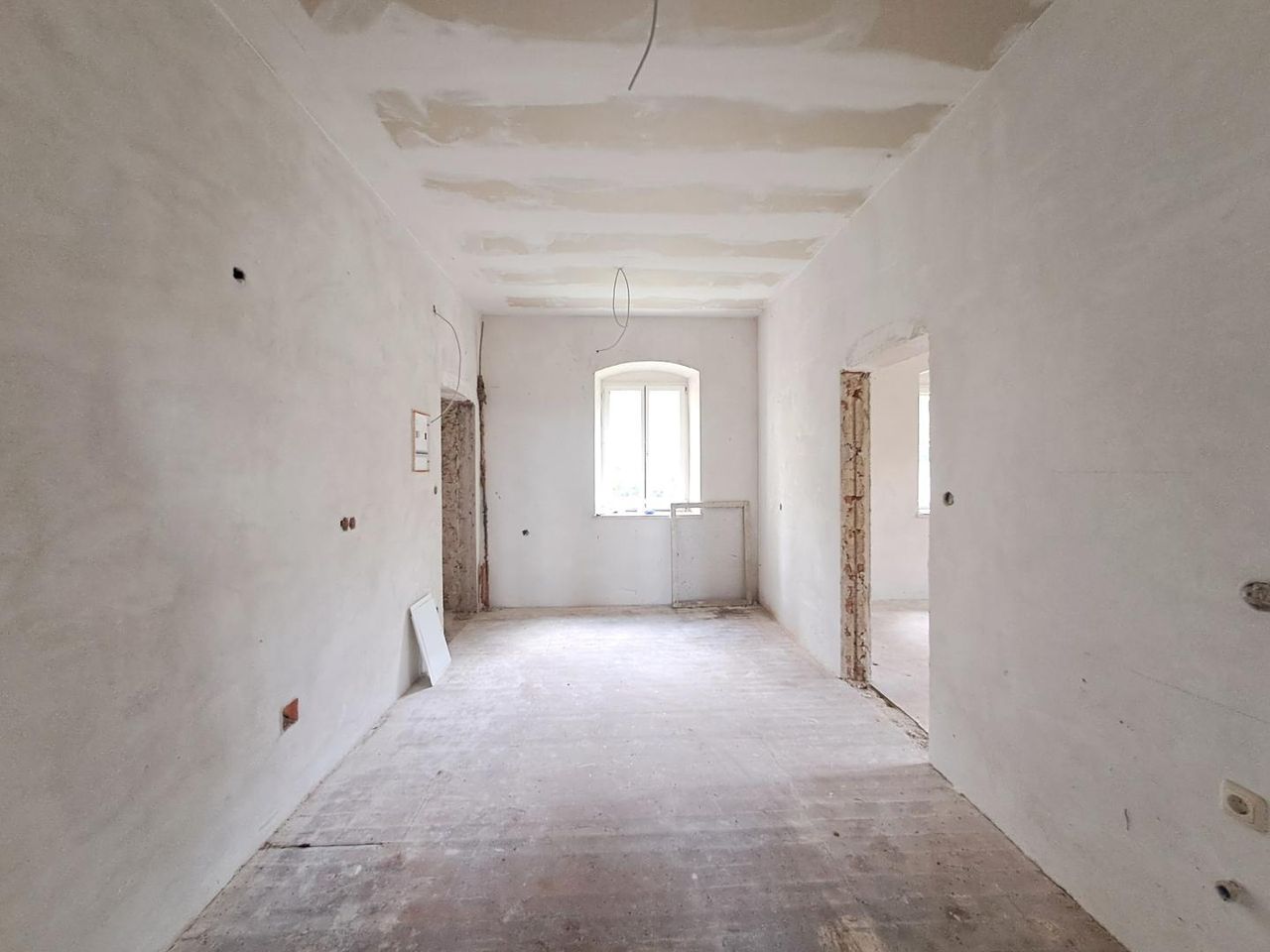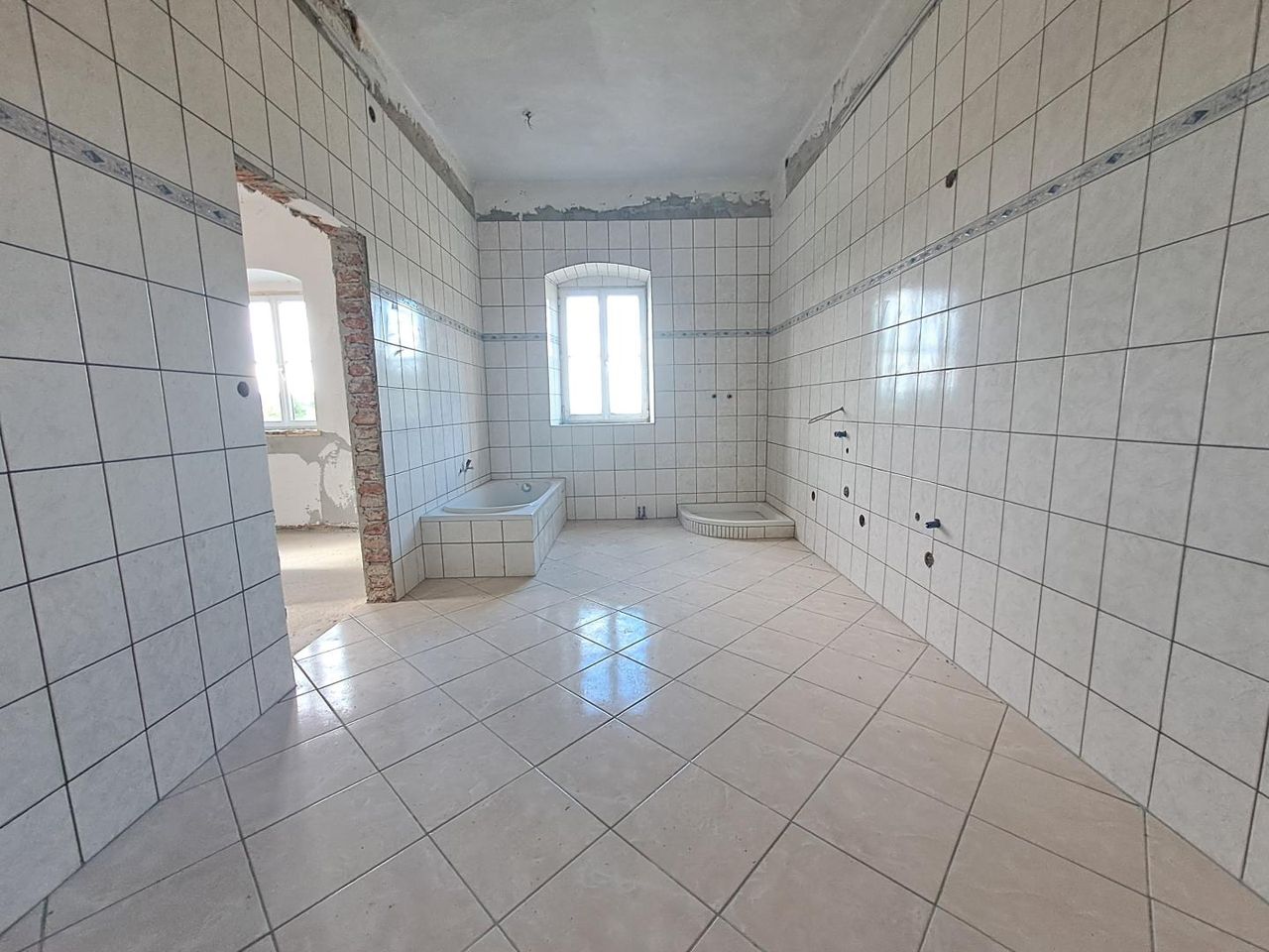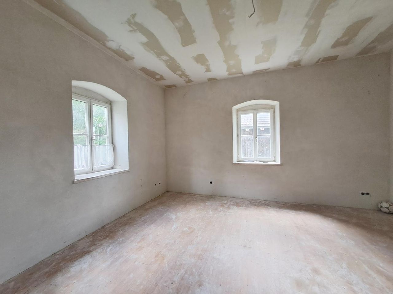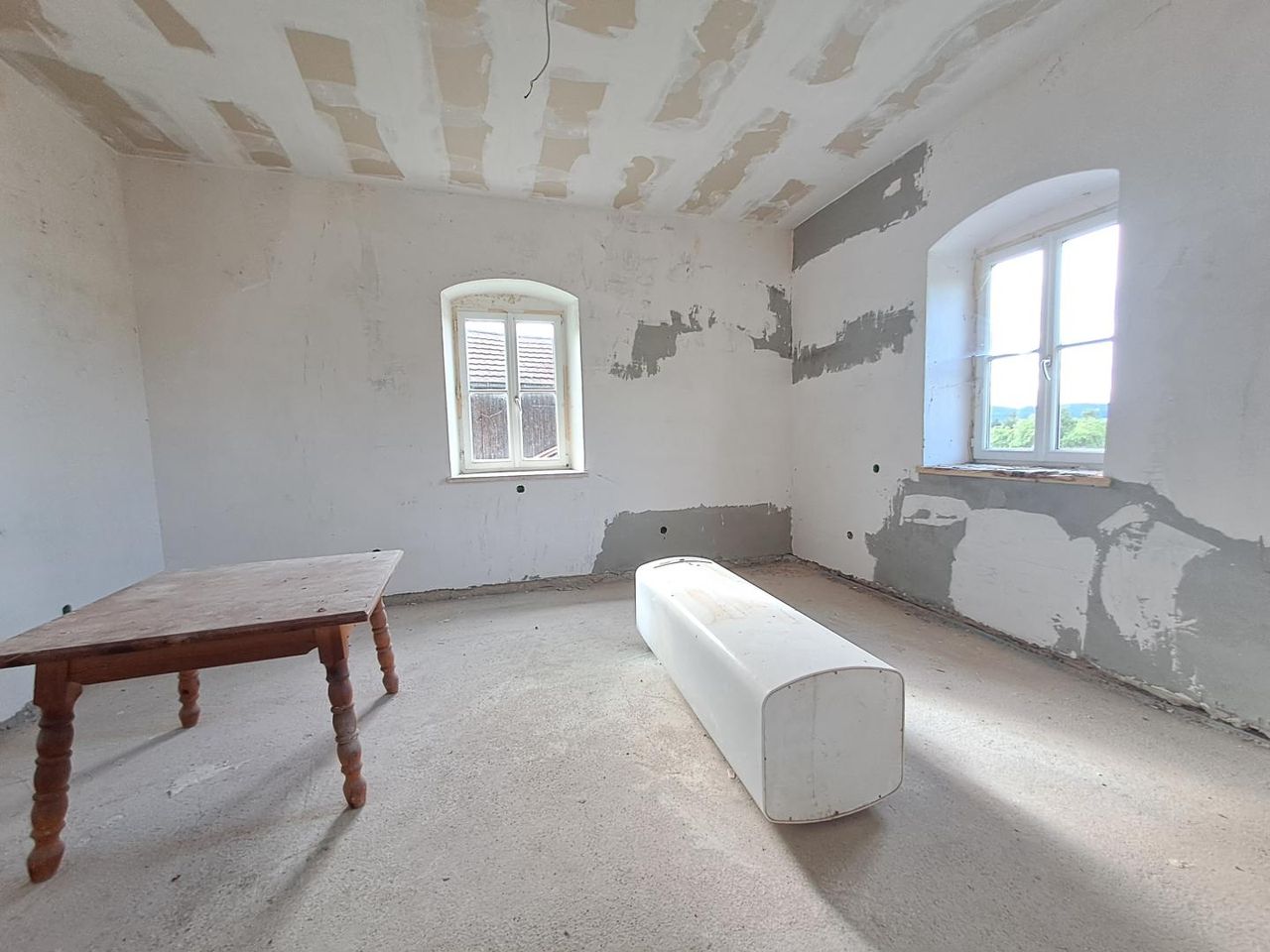 • Teilweise begonnene Sanierungsarbeiten (Fenster, einzelne Räume im Rohbauzustand)