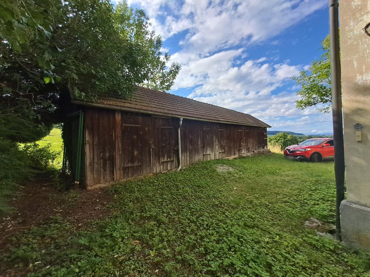 Ein großzügiger Holzstadel, ein angrenzendes Grünland und Parkfläche gehören ebenfalls zu diesem interessanten Angebot.