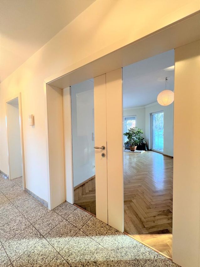 Das Erdgeschoß umfasst einen hellen Eingangsbereich mit Diele und Garderobe und Zugang zum Wohn/Esszimmer mit Südausrichtung und Ausgang über die Terrasse zum natürlich angelegten Garten. Die Küche ist getrennt mit direktem Eingang von der Diele aus und geschickter Verbindung zum Essbereich.