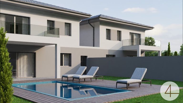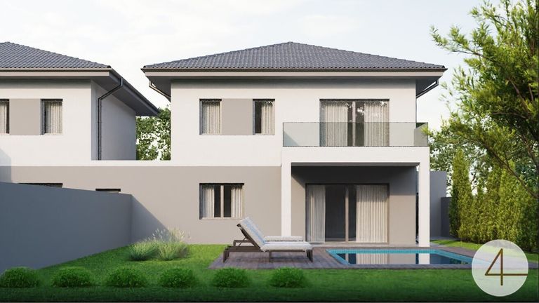 - Erdgeschoß: Vorraum, Bad-WC , Küche, Wohnzimmer mit Ausgang in den Garten, Esszimmer, Gästezimmer, Technikraum und Abstellraum.