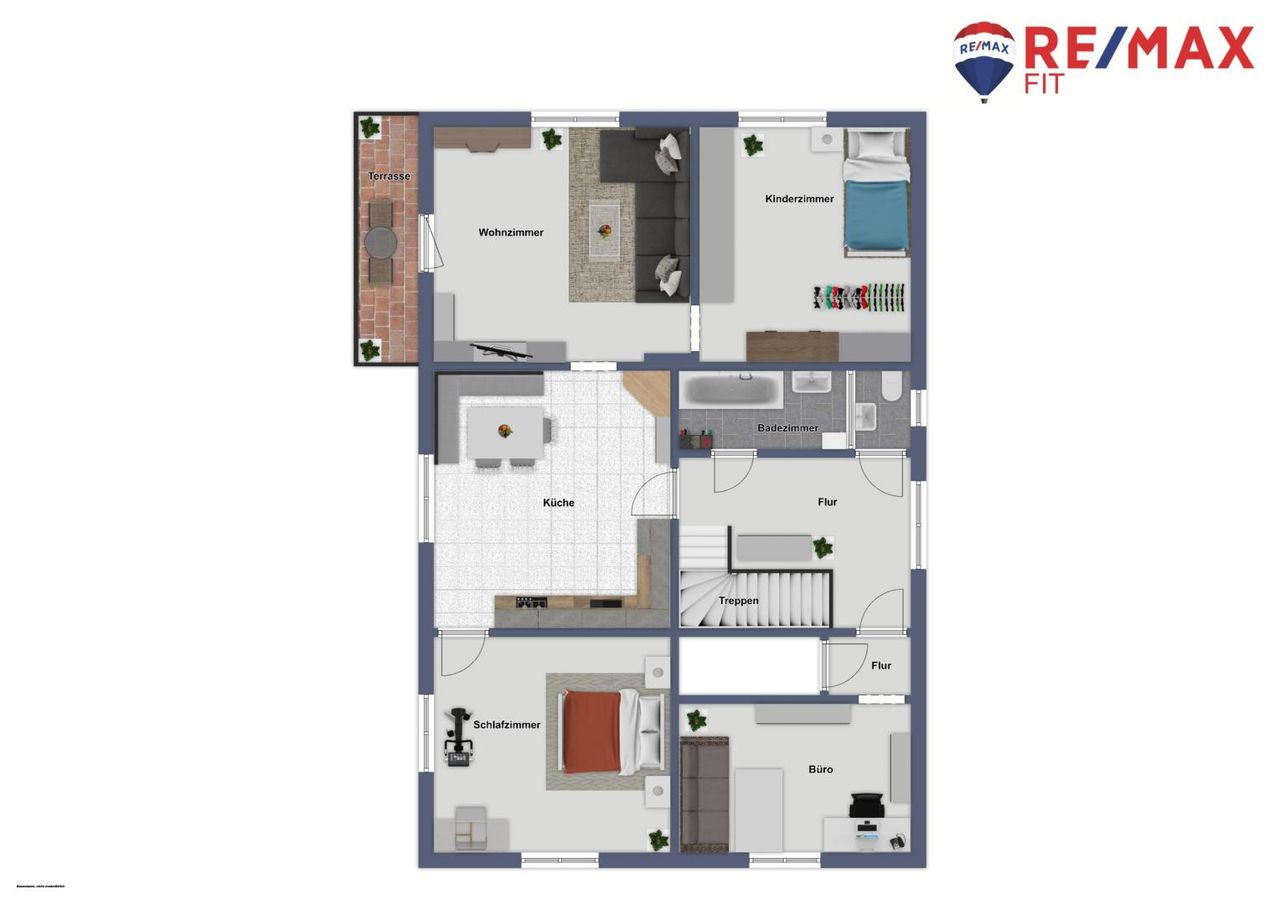 Obergeschoss: 4 Zimmer, Küche mit Essbereich, Zugang zum Süd-Balkon