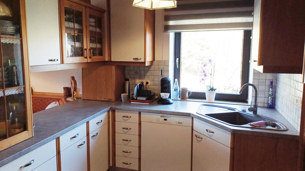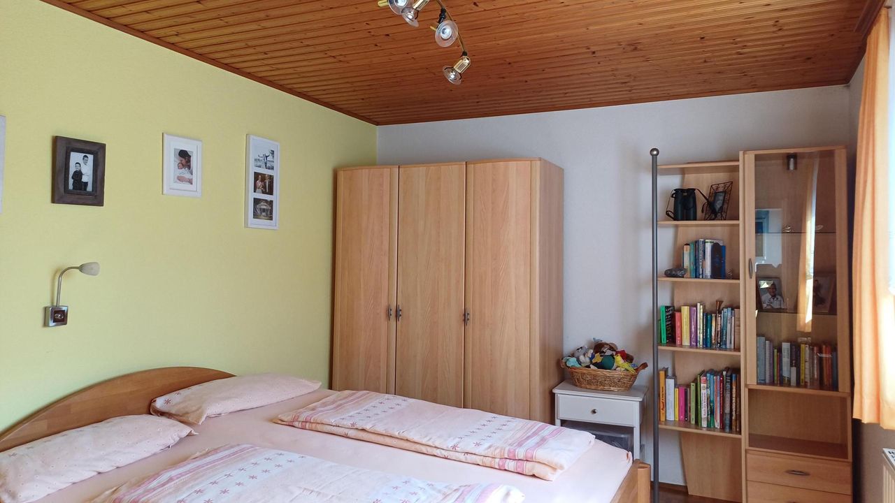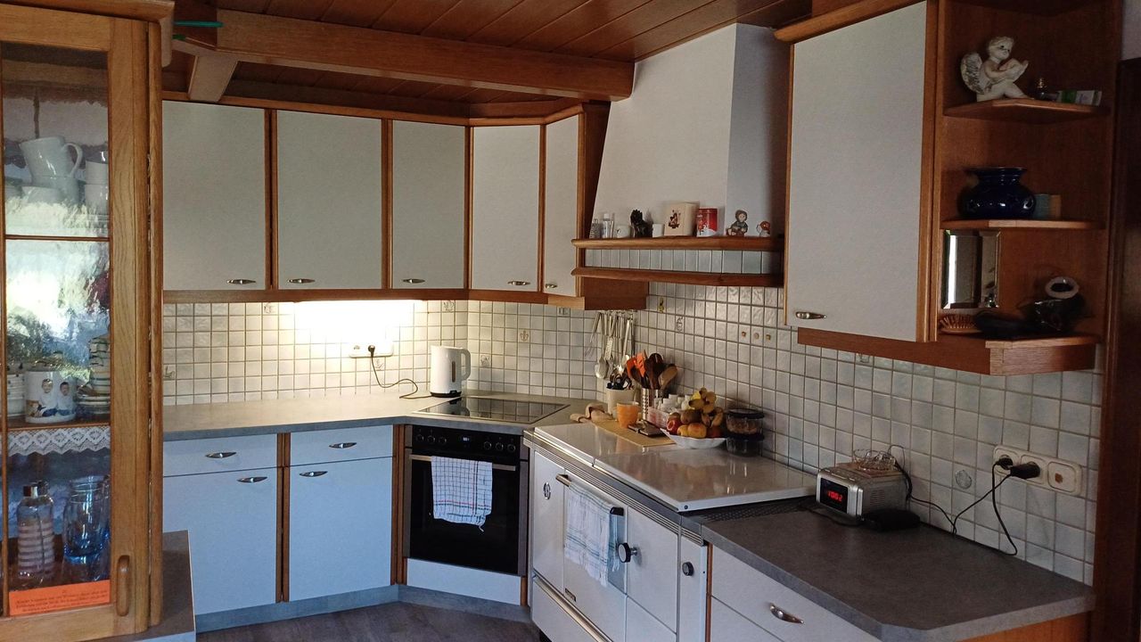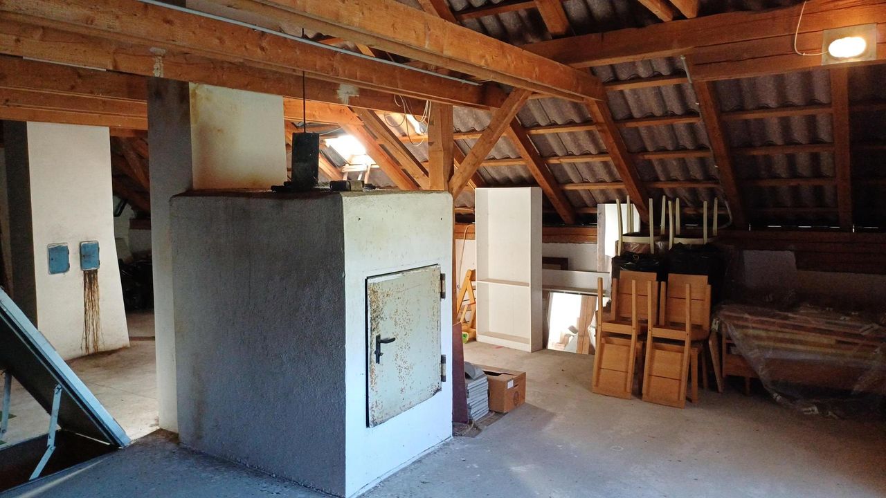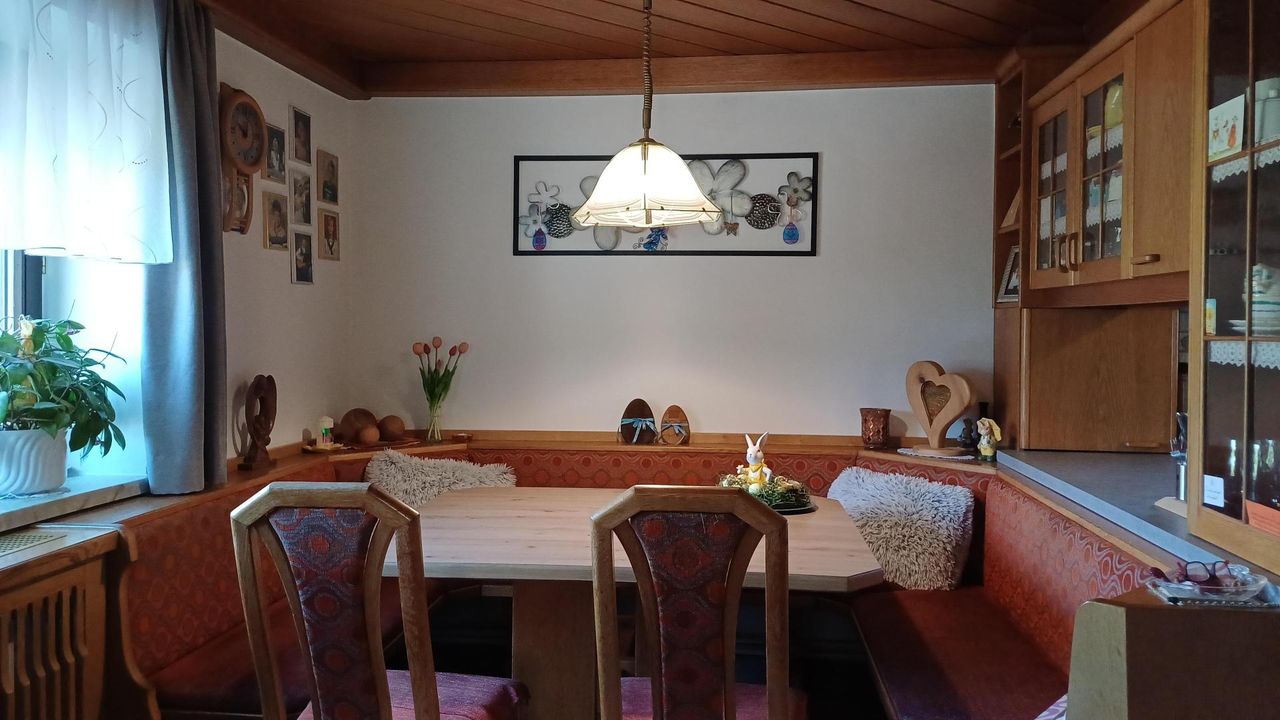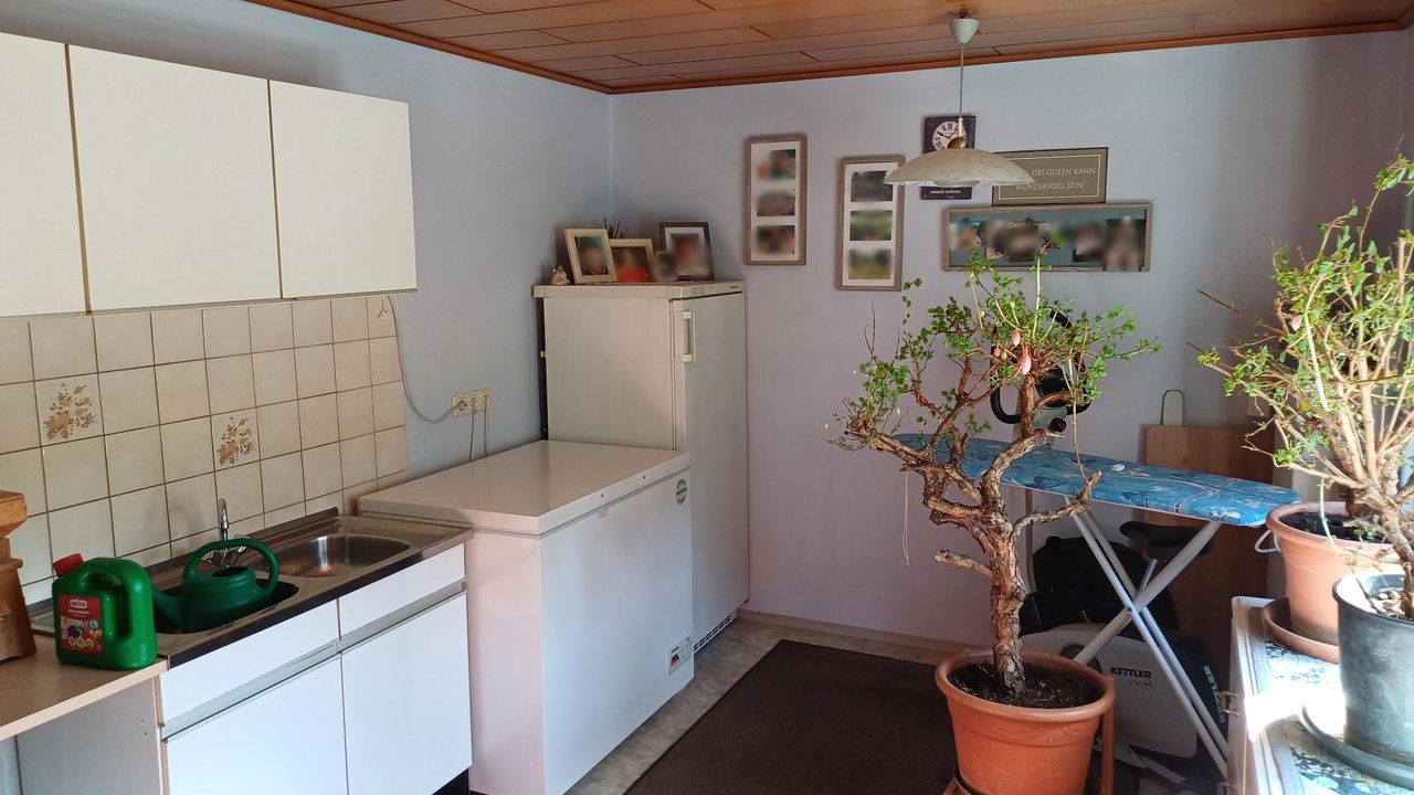 Das Wohnhaus, das etwa 1963 erbaut und aufgestockt wurde, bietet ca. 160 m² Wohnfläche. Im Erdgeschoss befinden sich eine große Küche mit Essplatz und Holzofen, ein gemütliches Wohnzimmer, ein Schlafzimmer sowie ein separates WC und ein Heizraum, welcher auch als Waschküche und Schmutzschleuse dient. Von hier aus gelangt man in die angrenzenden Wirtschaftsräume.