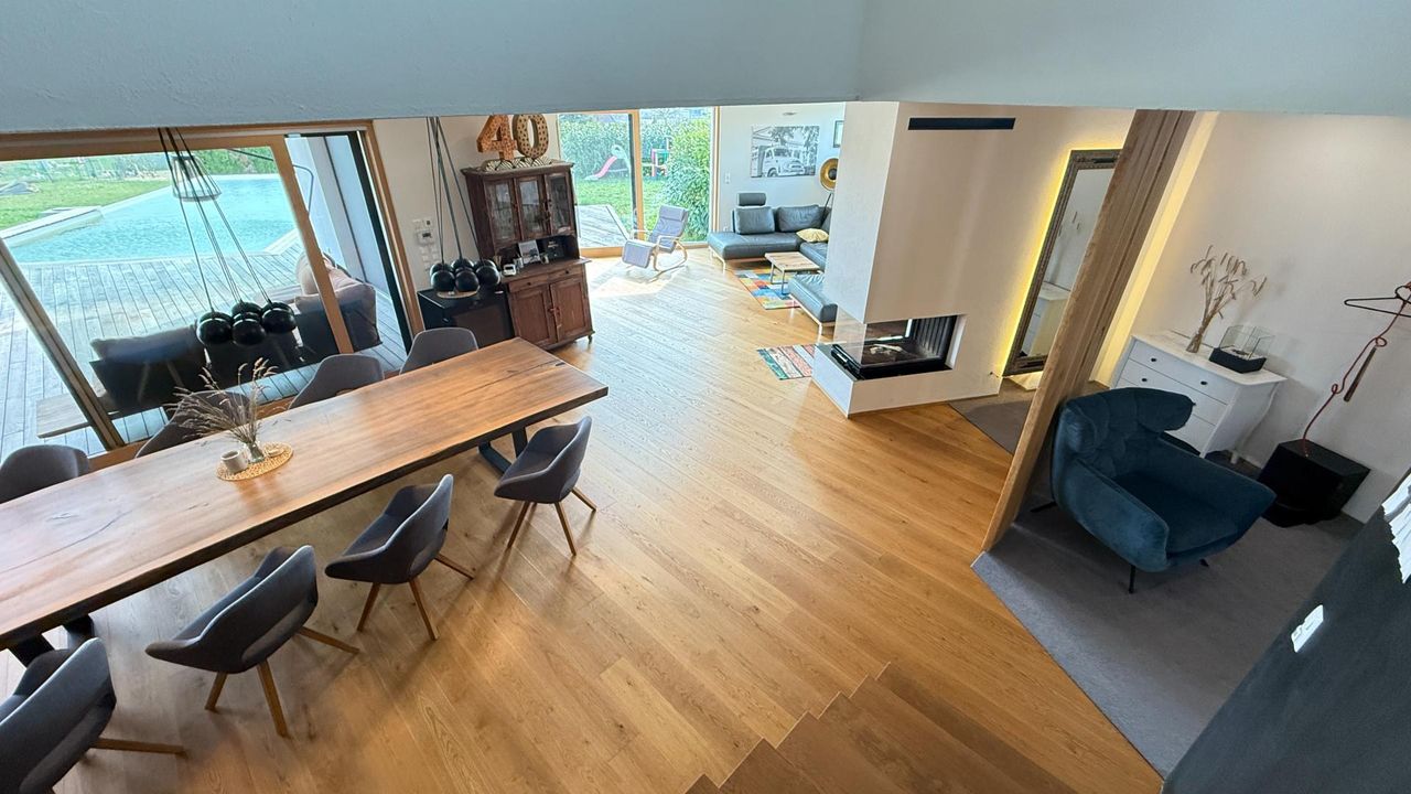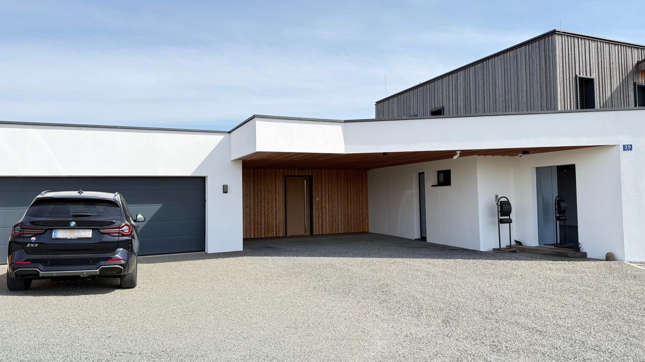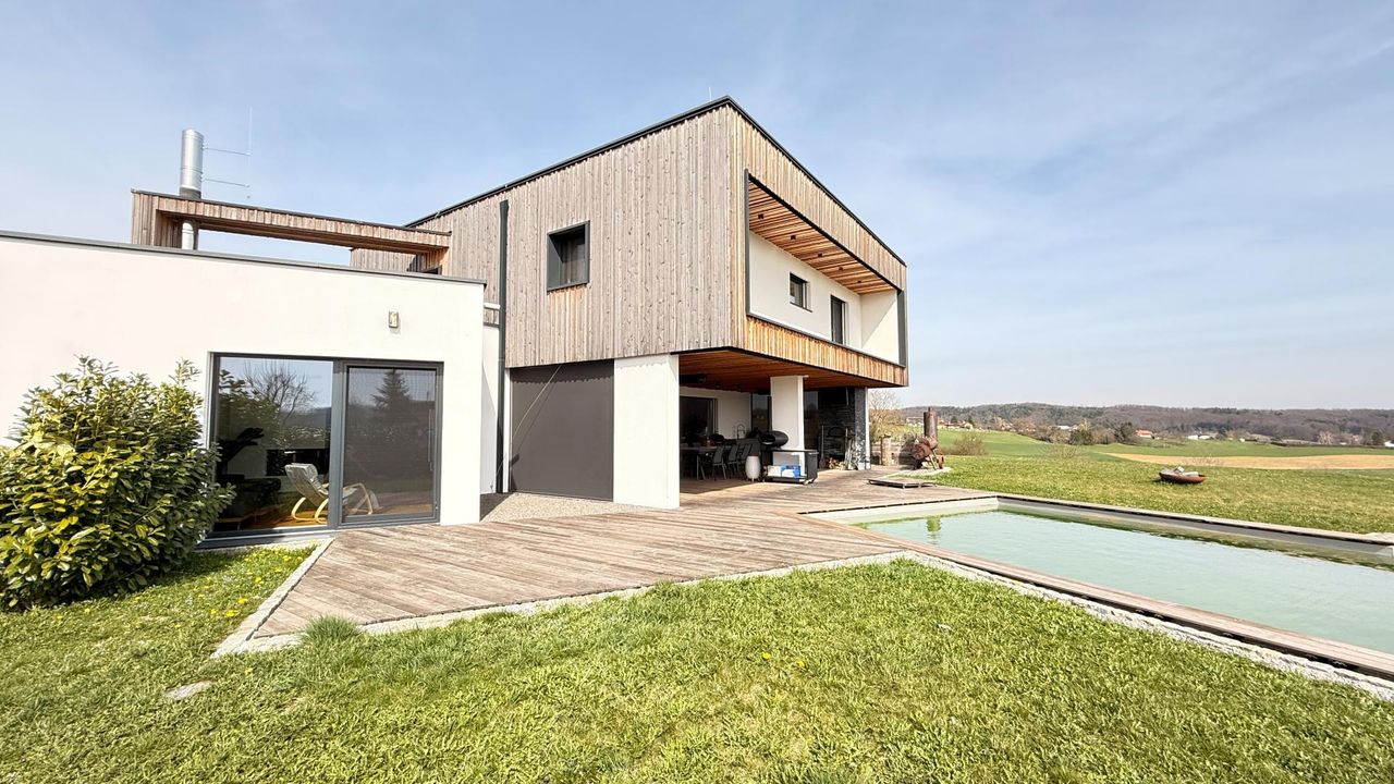 Die in ökologischer Holzriegelbauweise errichtete Liegenschaft verfügt über eine Wohnfläche von ca. 250 m² sowie eine Gesamtnutzfläche von ca. 320 m² und überzeugt durch eine durchdachte Raumaufteilung sowie lichtdurchflutete Wohnbereiche.