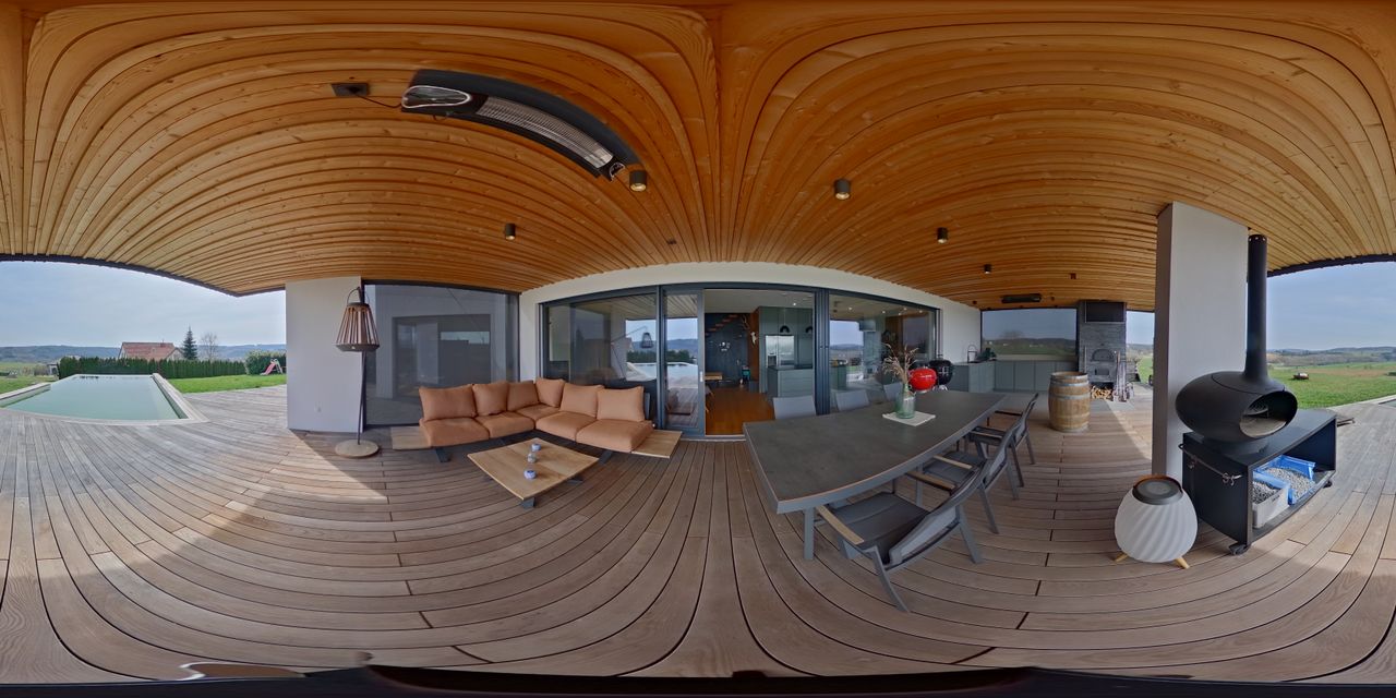 Die großzügige, überdachte Terrasse erweitert den Wohnraum ins Freie: