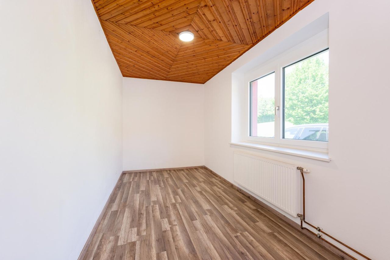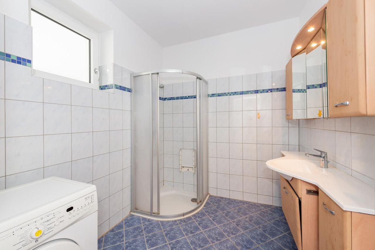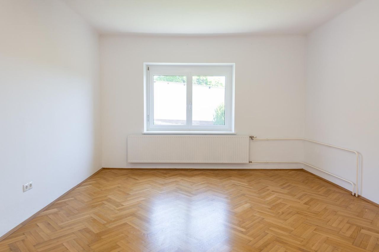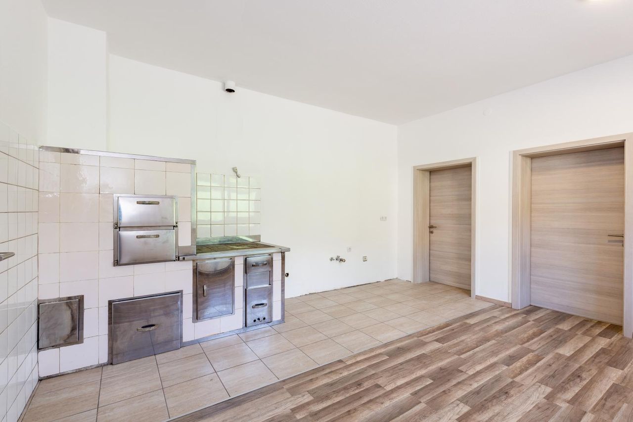 Die Wohnfläche von rund 138 m² verteilt sich auf vier gut geschnittene Zimmer, zwei Vorräume, eine große Küche mit originalem Holzherd, sowie ein Badezimmer mit Dusche, Fenster und Waschmaschinenanschluss.