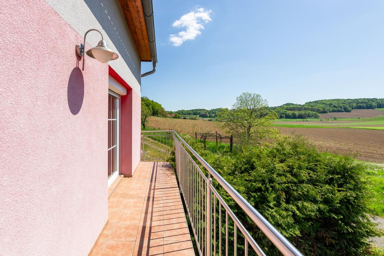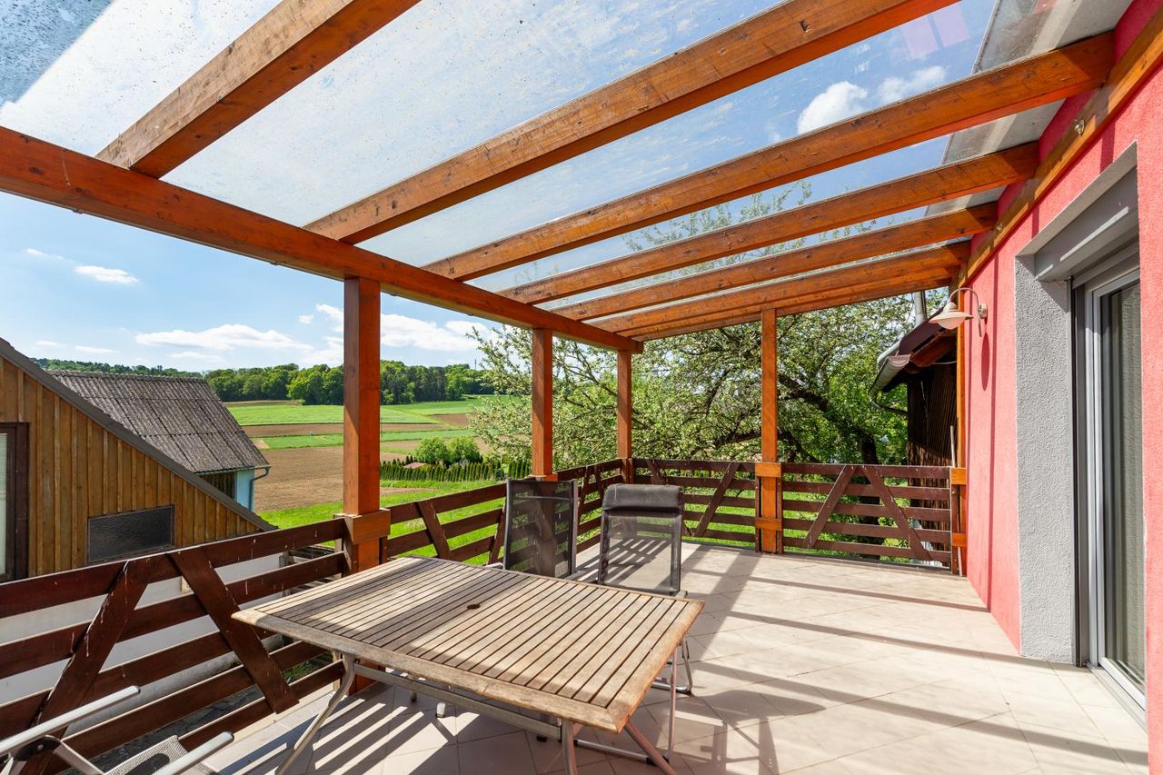Zur sonnigen Westseite hin öffnet sich ein schmaler Balkon mit herrlichem Fernblick, ergänzt durch eine großzügige, überdachte Terrasse im Erdgeschoss. Der Garten ist liebevoll angelegt – mit altem Obstbaumbestand und einer Isabellatraubenhecke, die im Spätsommer zur süßen Ernte einlädt.