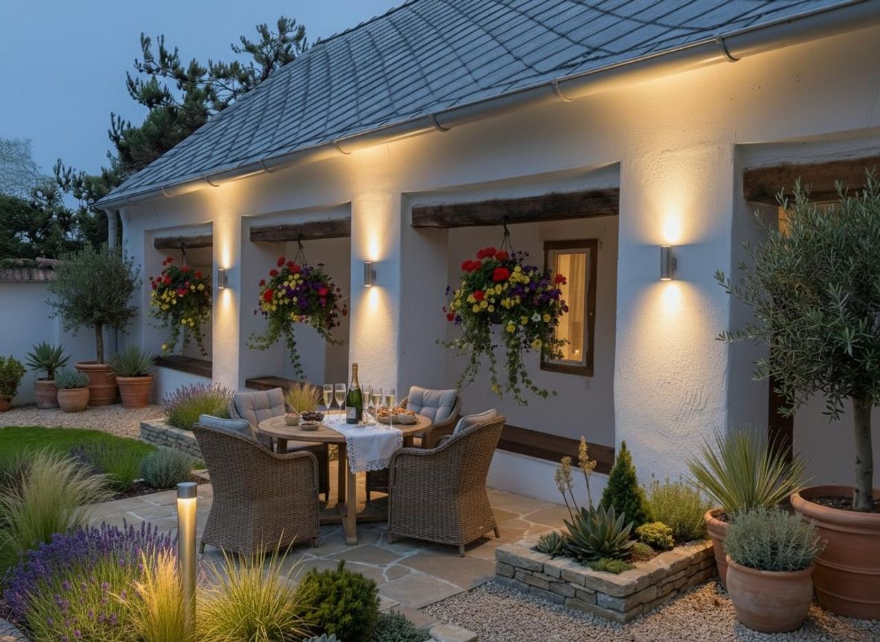 Das Anwesen besteht aus einem Dreikanthof mit Garten.
