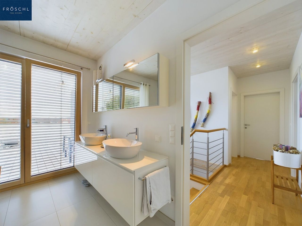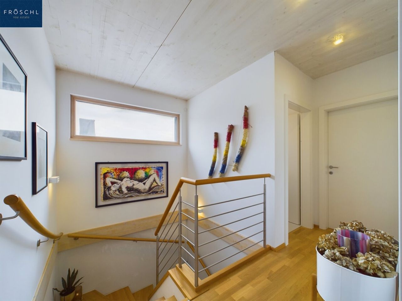 Im Obergeschoss befinden sich drei gemütliche Zimmer, ein praktischer Schrankraum, ein stilvolles Badezimmer, ein separates WC und ein heller Gang. Das Erdgeschoss besticht durch offene Wohnküche, drei Abstellräume, einladenden Vorraum, Bad/WC, Haustechnikraum und eine geräumige Garage.