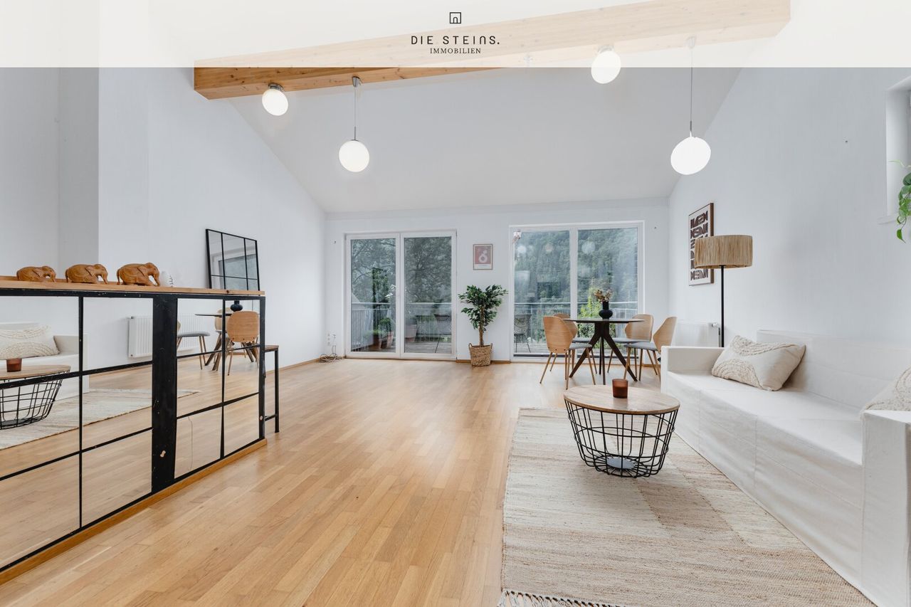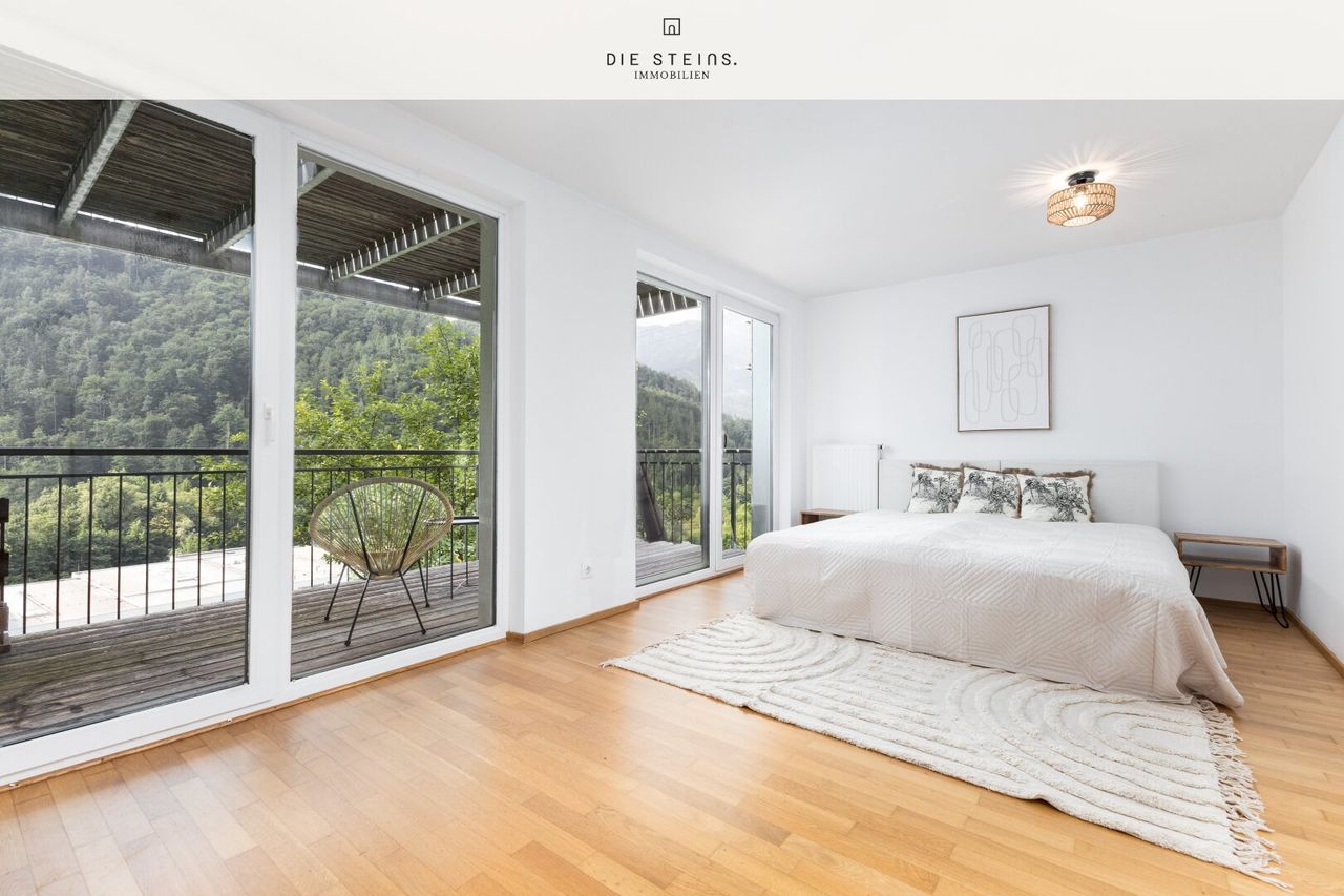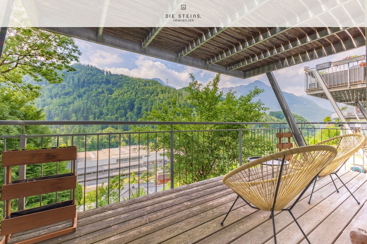 Das Haus erstreckt sich über drei Ebenen und bietet durchdachten Wohnkomfort auf rund 120 m² Nutzfläche. Der lichtdurchflutete Wohnbereich mit Raumhöhen bis zu 3,50 m beeindruckt mit großzügigen Panoramafenstern, einem offenen Grundriss und direktem Zugang zum sonnigen Balkon. Hier genießt man den Ausblick ins Grüne und auf das Tennengebirge.